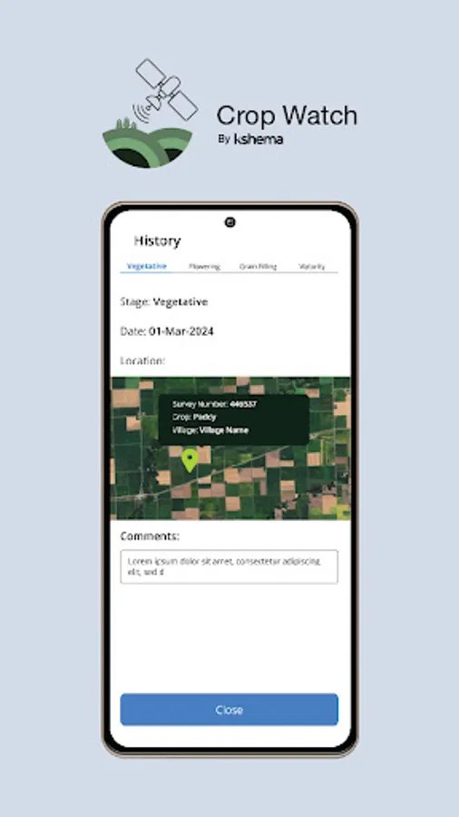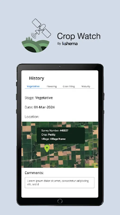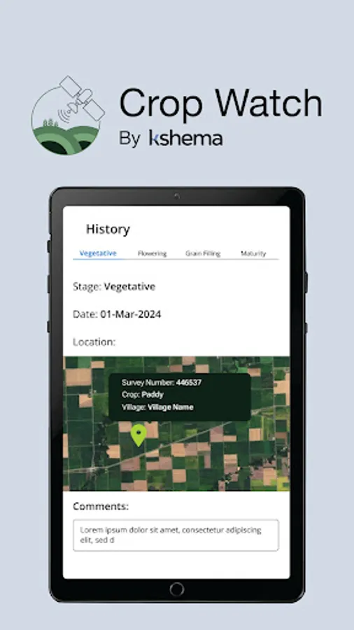 Kshema Crop Watch offers advanced Crop Health Monitoring (CHM) module that plays a pivotal role in evaluating the health of crops across different growth stages—Vegetative, Flowering, Grain Filling and Maturity. By systematically collecting real-time data through image analysis and data inputs, this module helps in assessing the effectiveness of crop management strategies. The insights gained from the CHM process assist in identifying issues like diseases, nutritional deficiencies, and other related concerns, providing timely and relevant information for better decision-making throughout the agricultural season. Continuous monitoring and evaluation enable the refinement of practices, ensuring healthier crops and more productive yields.