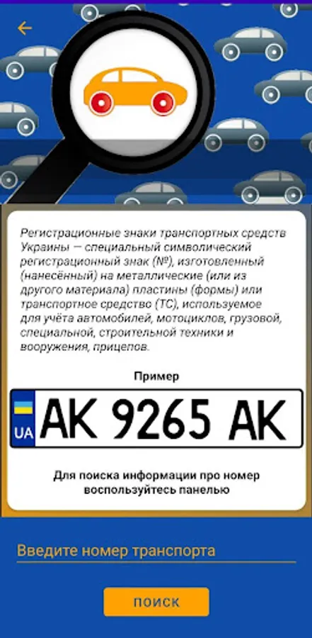 The application allows you to view brief information about the car using the state number absolutely free of charge.