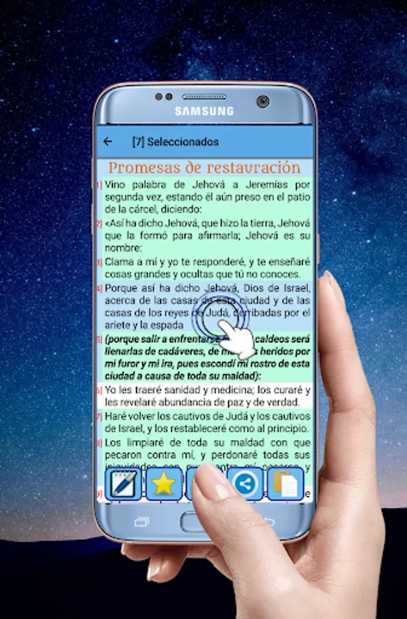 You can select one or several verses of a chapter and mark as a favorite, you can also share the verses with your friends on different social networks.