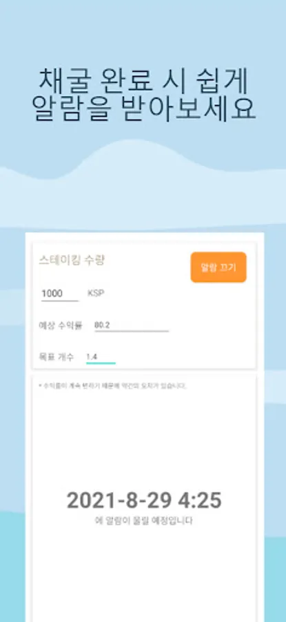 It is an app that sets the staking amount, expected return, and target number, and sounds an alarm when the target number is achieved.