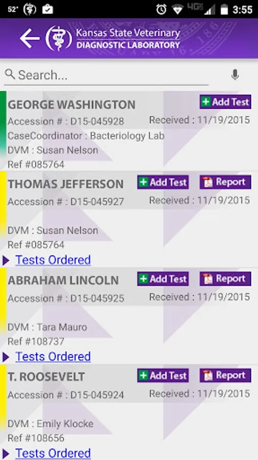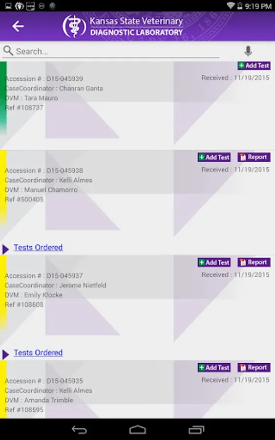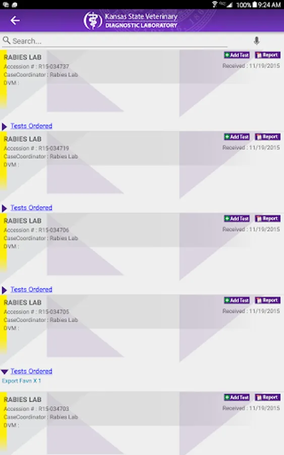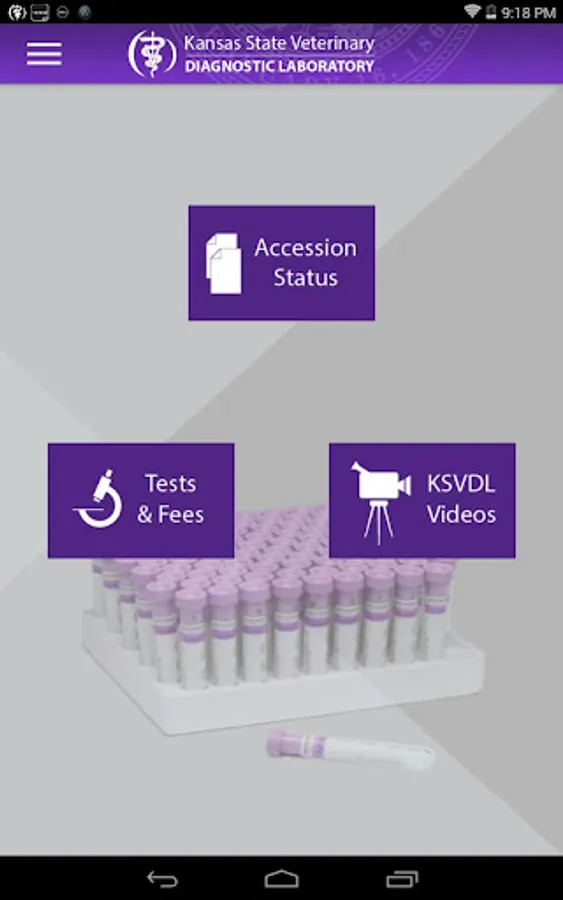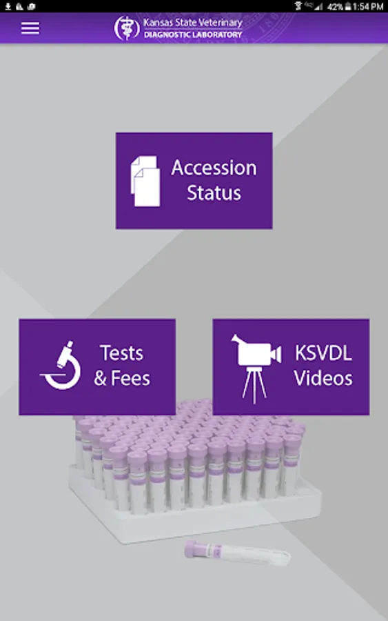 Track your samples from accessioning through final test results at the Kansas State Veterinary Diagnostics Lab. Designate how you receive push notifications as samples are accessioned into the lab, when individual test results become available, and when accession results are finalized. View and share results in PDF format.