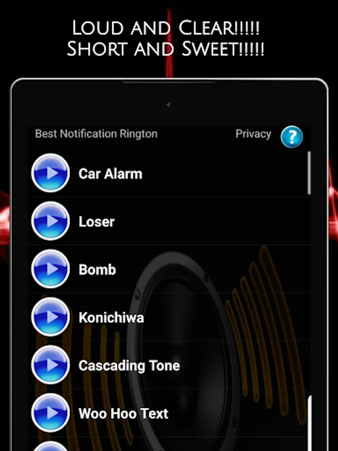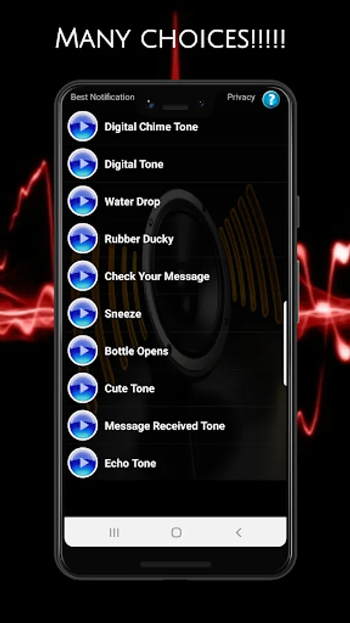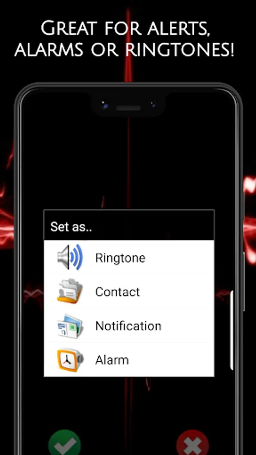 🎵 Preview and Customize: Easily preview each sound with a simple press. If you find one you love, customize it by pressing the settings button (red gear icon) and selecting notification, ringtone, alarm, or assign it to specific contacts.