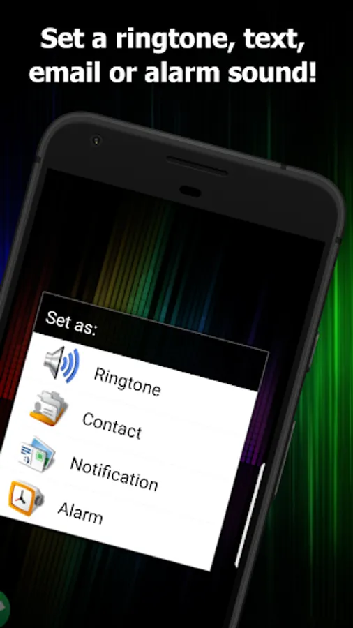 Simply press to listen to the loud and clear ringtone or sound. If you like it, press the green check and select either ringtone, alarm, notification, or contact.