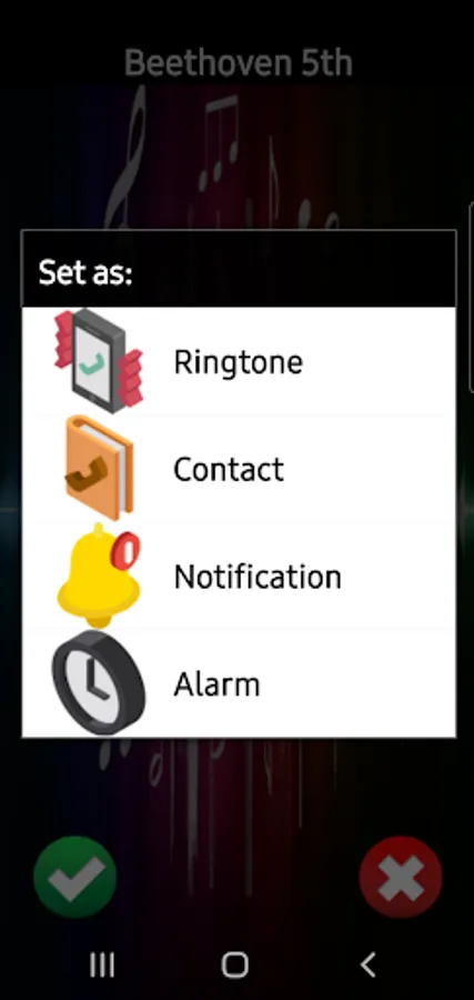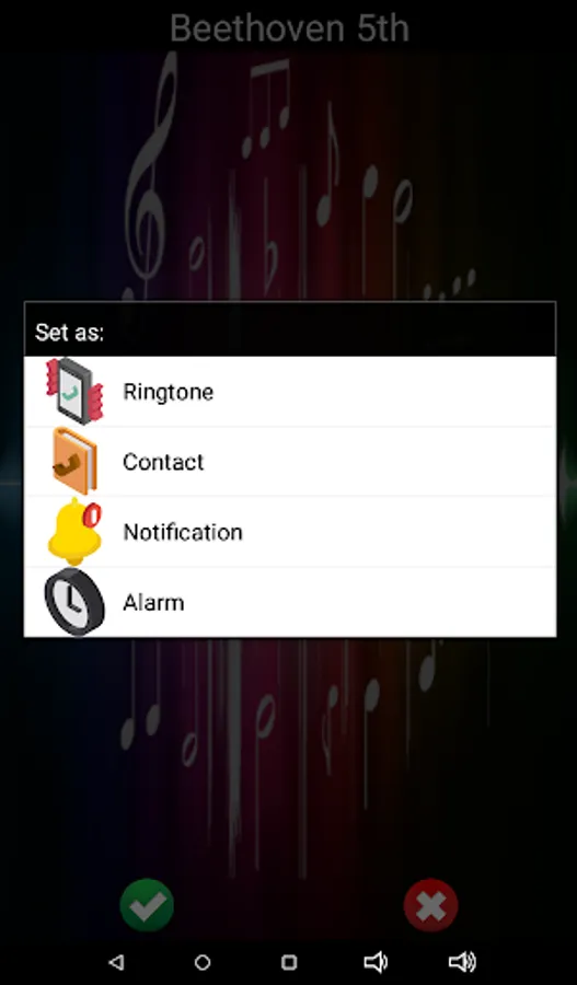 🎼 Simply press and listen to preview the loud and clear ringtone or sound. If you like it, press the green check and then select either ringtone, alarm, notification, or contact. 🎹