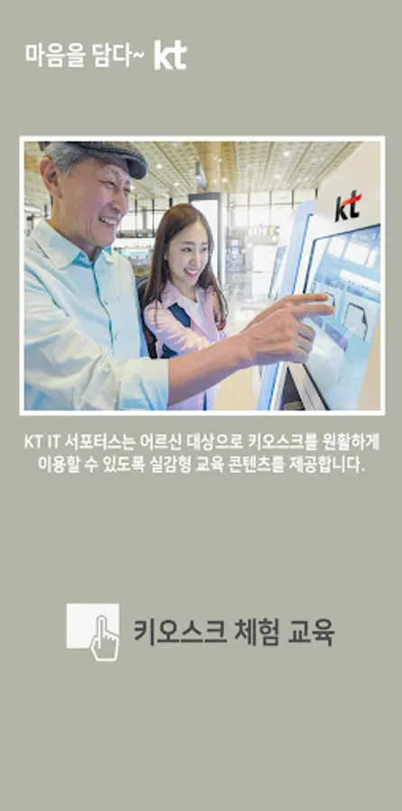 KT Kiosk educational applications are developed/provided to help the use of kiosks in life such as fast food, cafe orders, train reservations, ATMs, unmanned civil service issuance, hospitals, etc., which were particularly difficult for the elderly due to the rapid development and unmanned digitalization.
