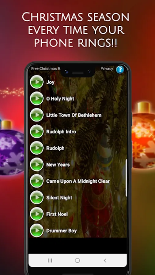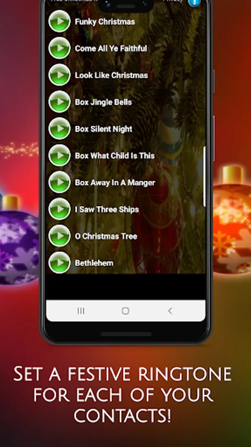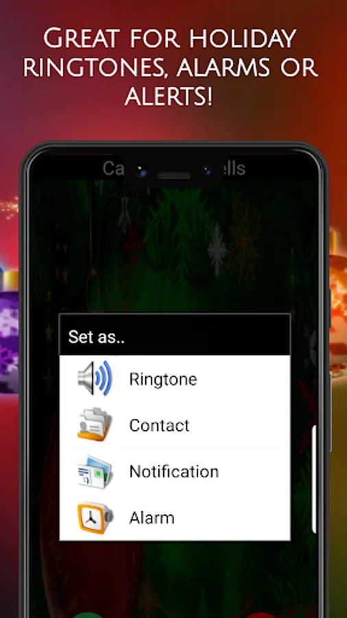 🎄 Simply press and listen to preview the loud and clear ringtone or sound. If you like it, press the green check and then select either ringtone, alarm, notification, or contact. 🎄