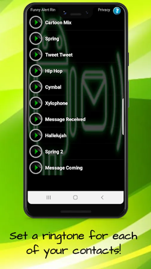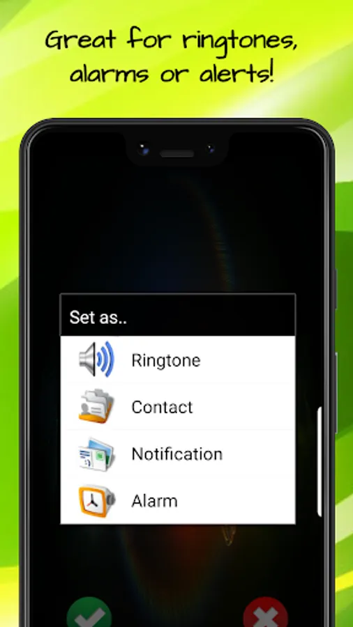 😎 Simply press and listen to preview the loud and clear ringtone or sound. If you like it, press the green check and then select either ringtone, alarm, notification, or contact. 😎