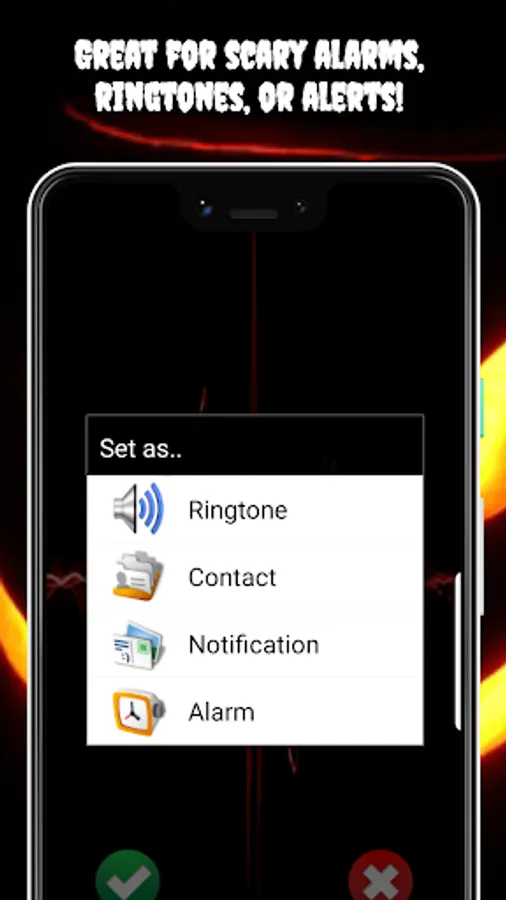 👹 Simply press and listen to preview the loud and clear ringtone or sound. If you like it, press the green check and then select either ringtone, alarm, notification, or contact.