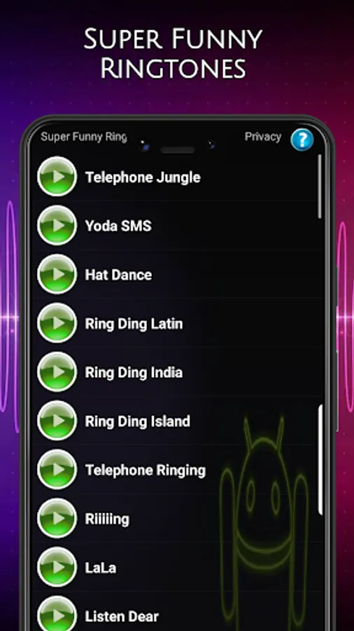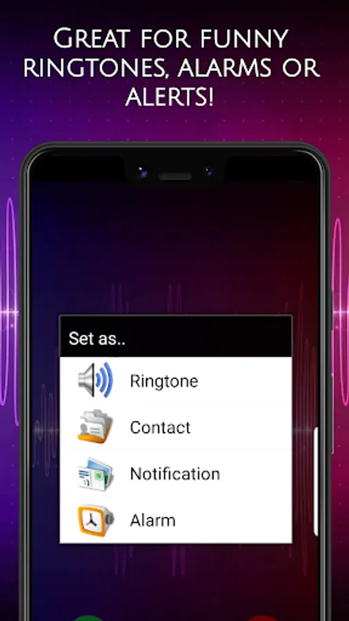 😂 Simply press and listen to preview the loud and clear ringtone or sound. If you like it, press the green check and then select either ringtone, alarm, notification, or contact. 😂