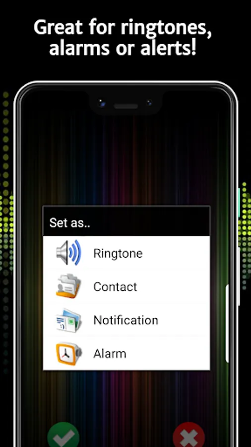 🎼 Simply press and listen to preview the loud and clear ringtone or sound. If you like it, press the green check and then select either ringtone, alarm, notification, or contact. 🎼