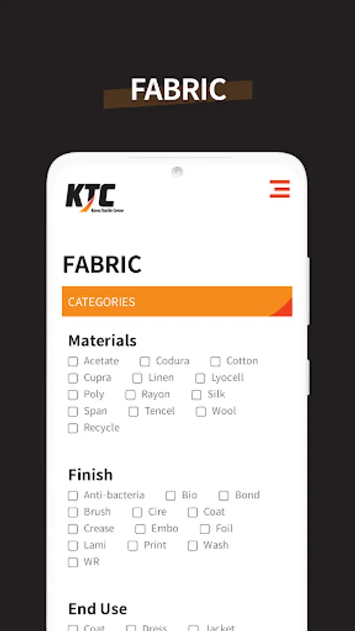 As a service operated by the Korea Textile Marketing Center, you can search and check textile product information.
