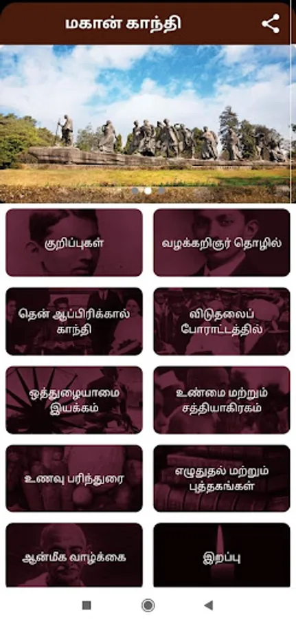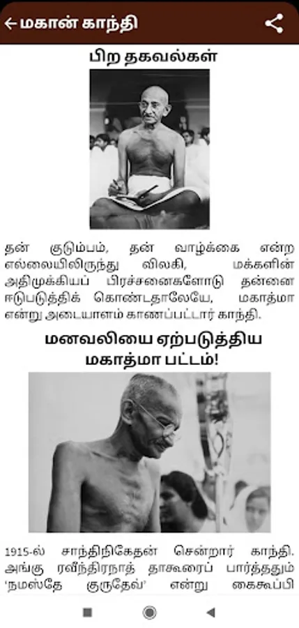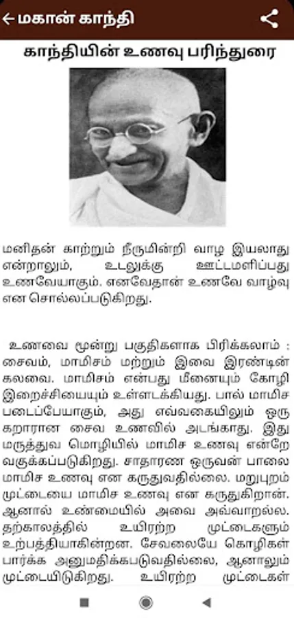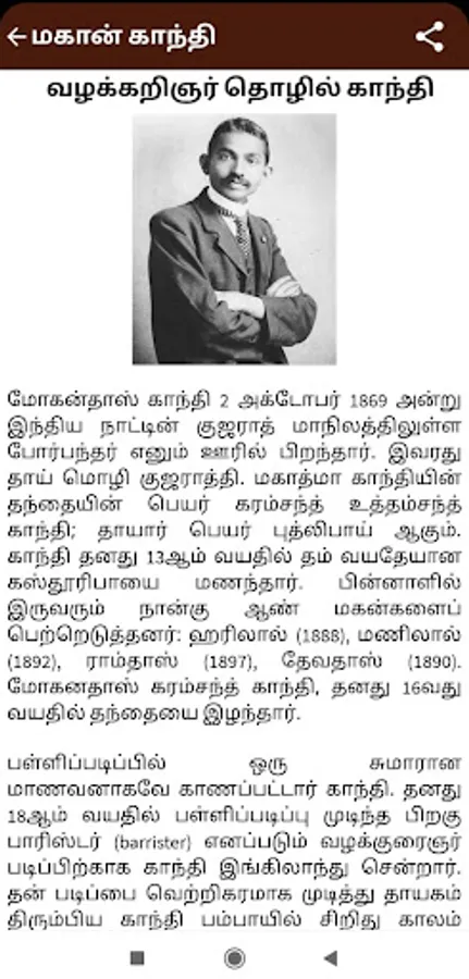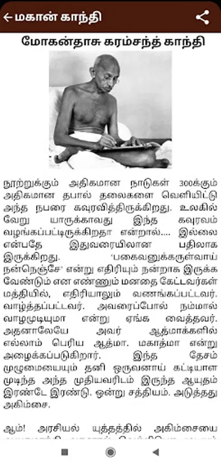 The Story of Experiments with Truth is the autobiography of Mahatma Gandhi, covering his life from early childhood through to 1921 in this APP Mahan Gandhi in Tamil Language. Also, we have given his golden words which useful to life.