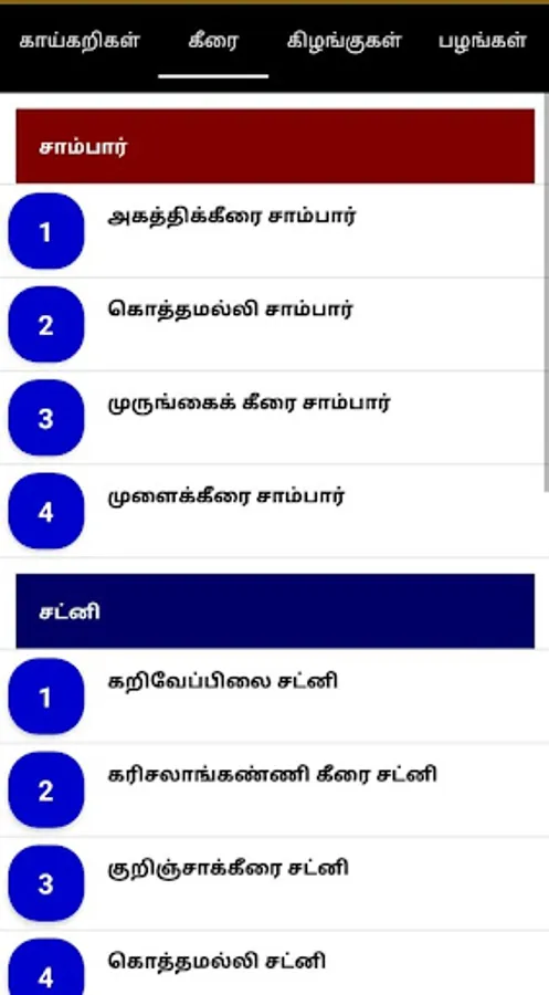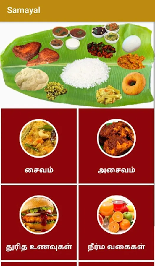 The various categories are as listed in Tamil Paarambariya Samayal App