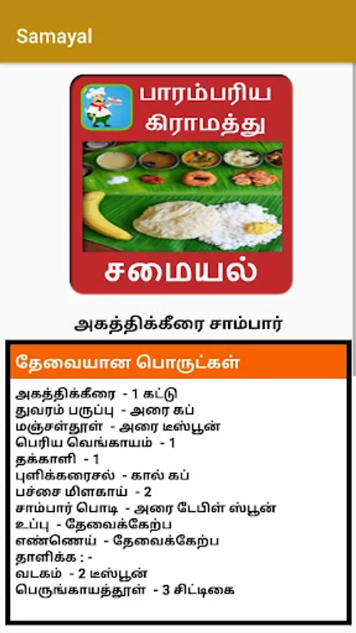 The App contains the best tamil veg and non veg recipes in Tamil Paarambariya Samayal App.