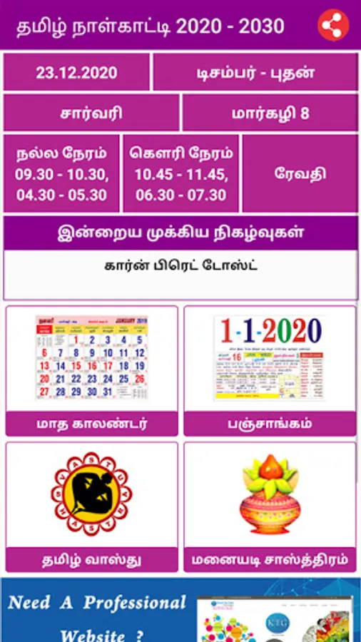 KTG - Knock The Globe Technologies, We successfully launched our free Tamil 2020 - 2030 Calendar - Vastu - Jothidam. On this year 2019 we updated new information like 2019 Calendar, Vastu, Jothidam, Rasipalan, Holidays, Festivals, Subha Muhurtham etc., ‘2020 - 2030 Tamil Calendar’ app is a completely free app which is available in Google Play Store. You may share all the information's in this Tamil 2020 - 2030 Calendar App.