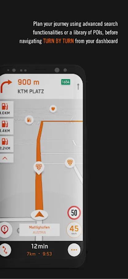 Plan your journey and adventure further with confidence. Powered by SYGIC and operating offline, the NAVIGATION feature uses industry standard mapping to guide riders to their destination of choice. Either use the advanced search feature, browse a diverse range of POIs including gas stations, restaurants, and rest stops or select one of your pre-saved destinations to easily find your way to your favorite roads. Concise directions are delivered turn by turn to your KTM bike’s dashboard, so you can focus on what’s important – the ride!