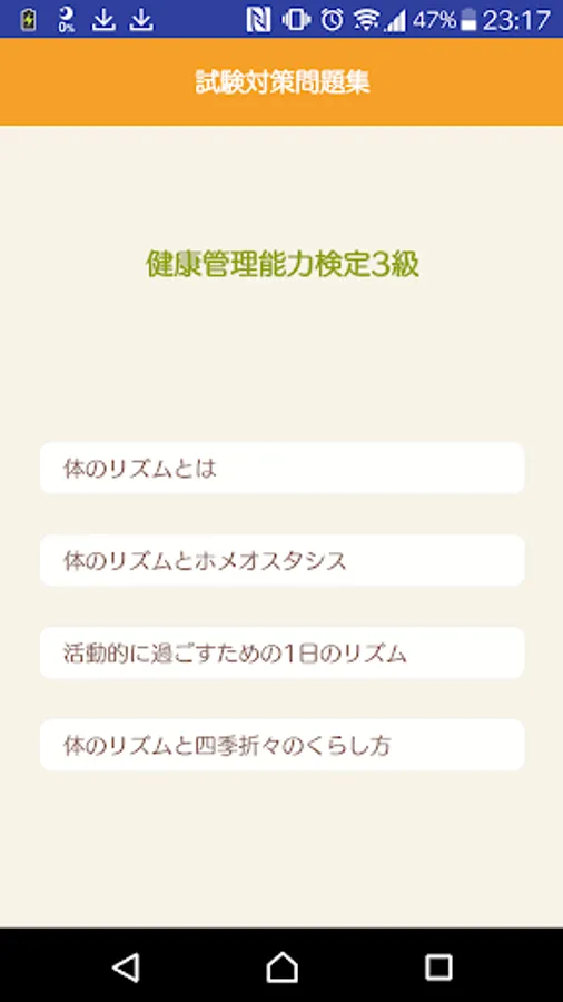 このアプリは特定非営利活動法人の日本成人病予防協会が開催する「健康管理能力検定 3級」の試験対策問題集です。