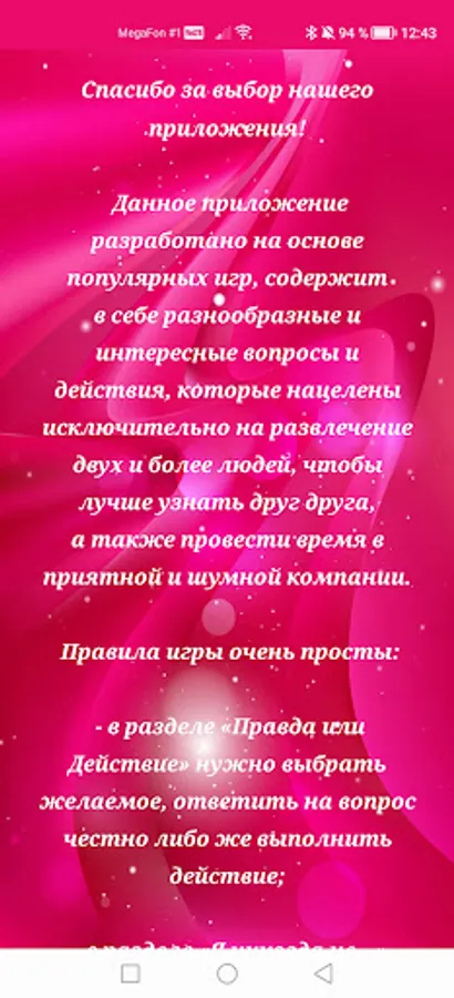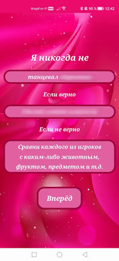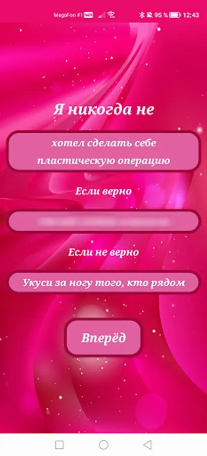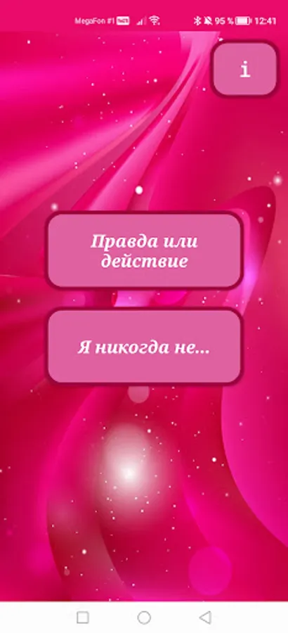 Our application is perfect for entertainment, because it contains two sections at once: the games "Truth or Dare" and "I have never", which contain the most interesting and varied questions, including tricky ones. Prepare yourself for questions such as: