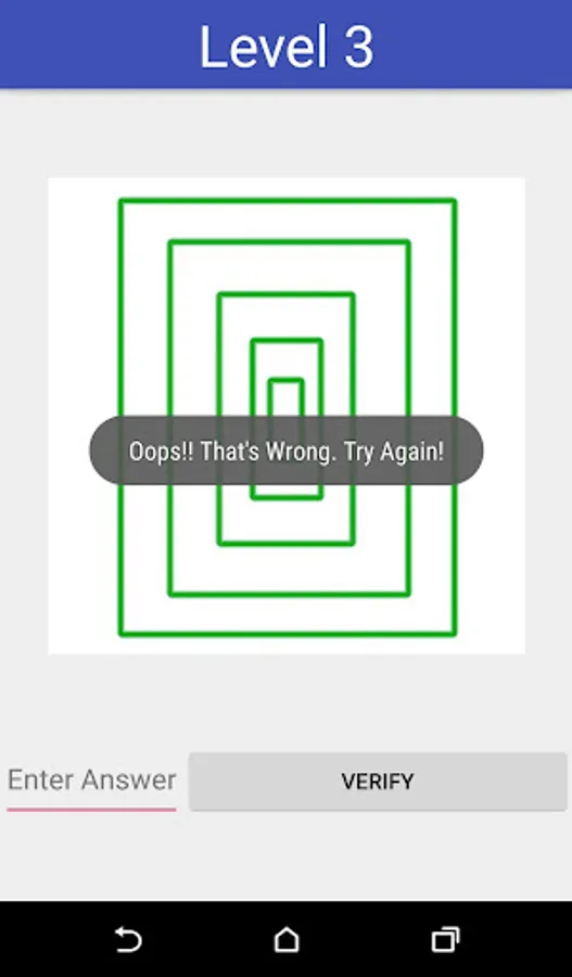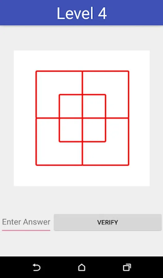 "How Many Squares" is a maths visual logic game which makes you to think differently, increase your logical ability and improve your lateral thinking. You have to count the number of squares in the displayed image and enter the answer to verify it. This is a fun based at the same time an addictive brain game having different levels. The difficulty increases as you move up the level from easy to very hard.