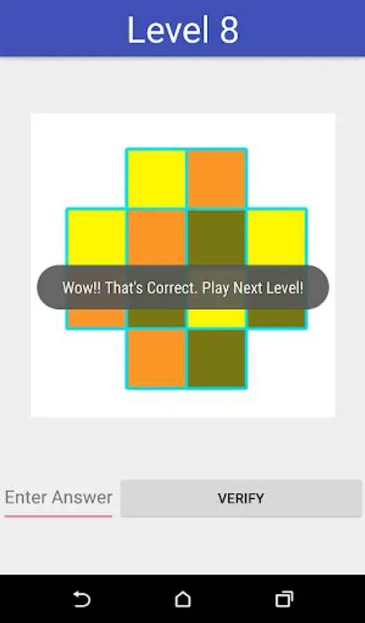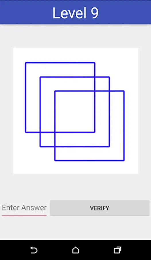 "How Many Squares" is a maths visual logic game which makes you to think differently, increase your logical ability and improve your lateral thinking. You have to count the number of squares in the displayed image and enter the answer to verify it. This is a fun based at the same time an addictive brain games having different levels. The difficulty increases as you move up the level from easy to very hard.