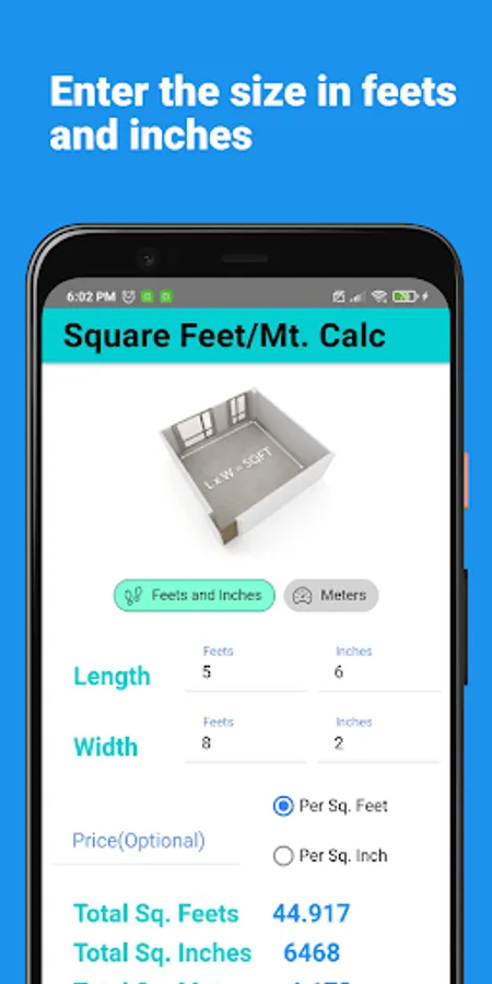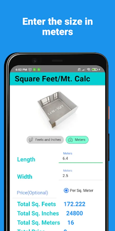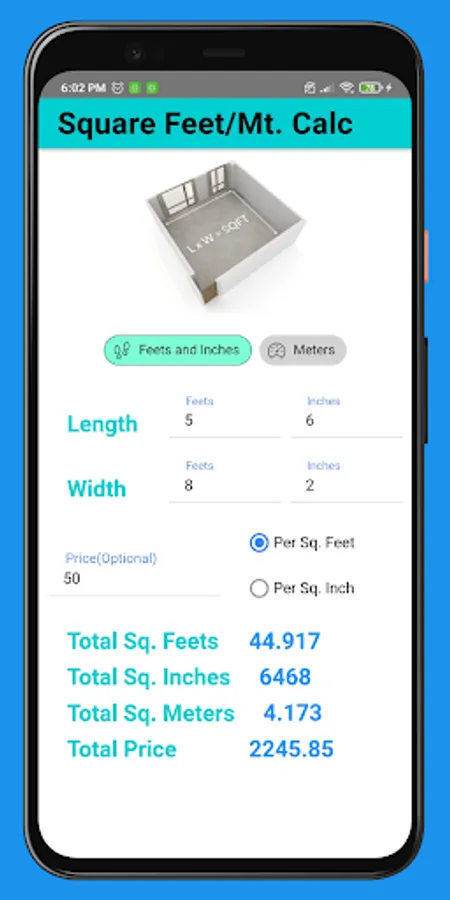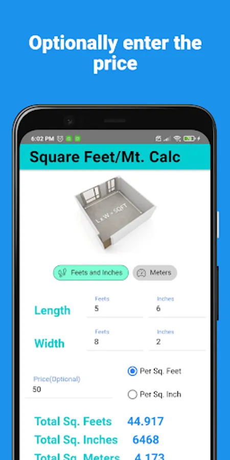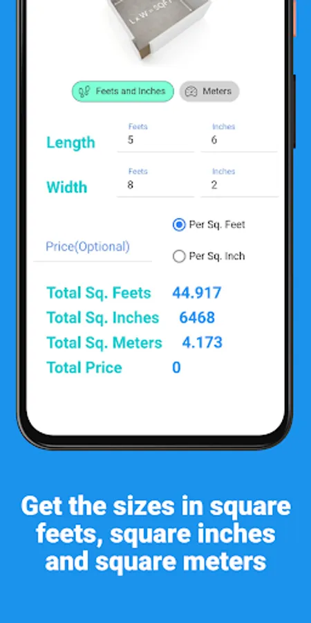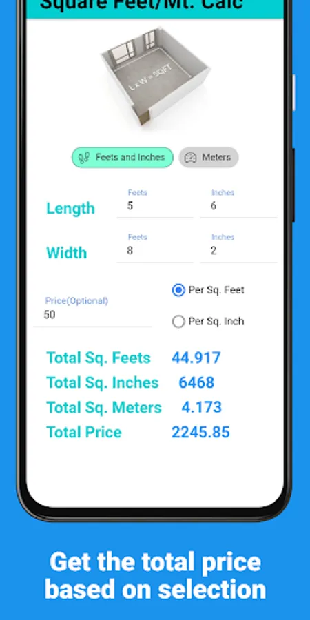 "Square Feet Meter Calculator" also lets you know the total price based on per square feet or per square inch or per square meter.