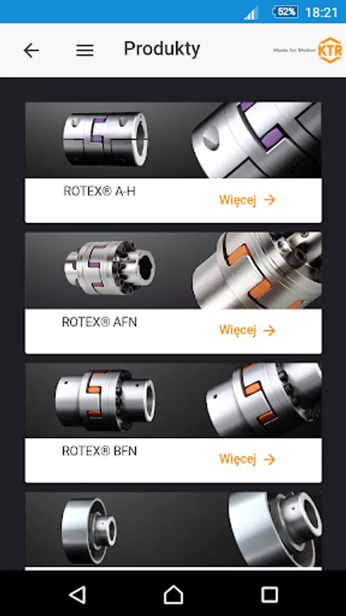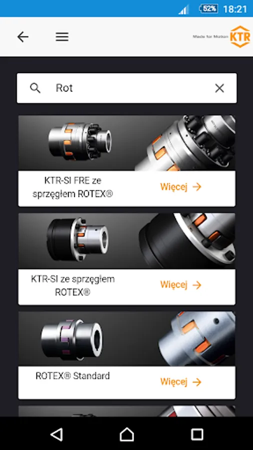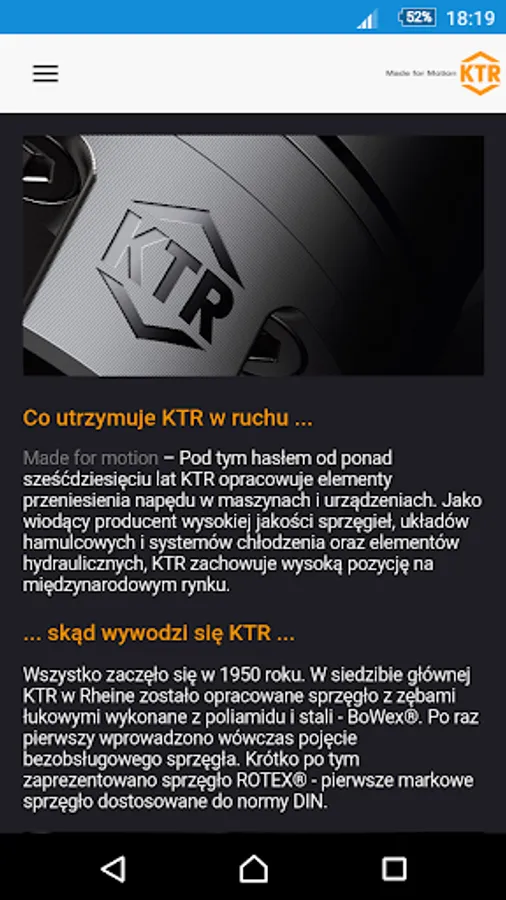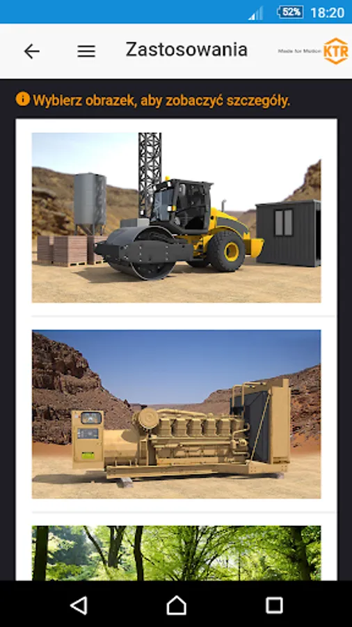 The application allows you to search and view the properties and uses of products KTR. It also provides contact information such as address, phone, email, geographical data.
