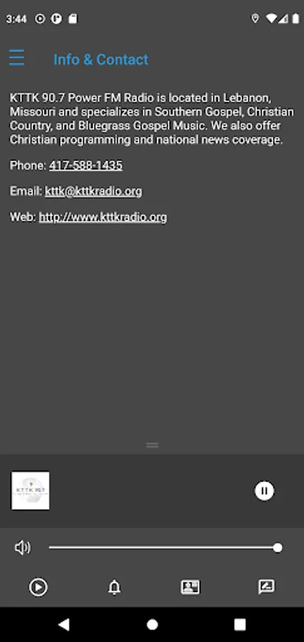 Listen to your favorite Southern Gospel, Christian Country and Bluegrass Gospel music on the go. All God's Music, All the Time. KTTK Christian Radio is located in Lebanon, Missouri, USA and can be found on the local radio dial at 90.7 FM.