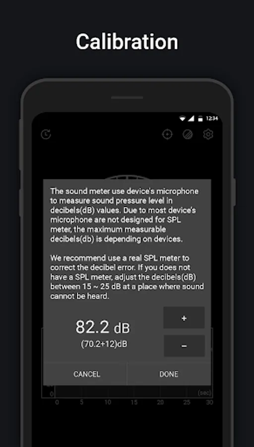 The value of decibel meter or sound meter(dB meter) is not as precise as an actual Sound Pressure Level Meter(SPL Meter), soundmeter, decibel meter or noise level meter, this is due to most device's microphone are aligned to human voice. To fix this, use an actual sound meter or sound pressure level meter (SPL meter) to adjust decibels error as close as possible before use. If you didn't own an actual Sound Pressure Level Meter (SPL meter), go to a very quiet place where sound cannot hear and adjust the reading value to 20~30dB.