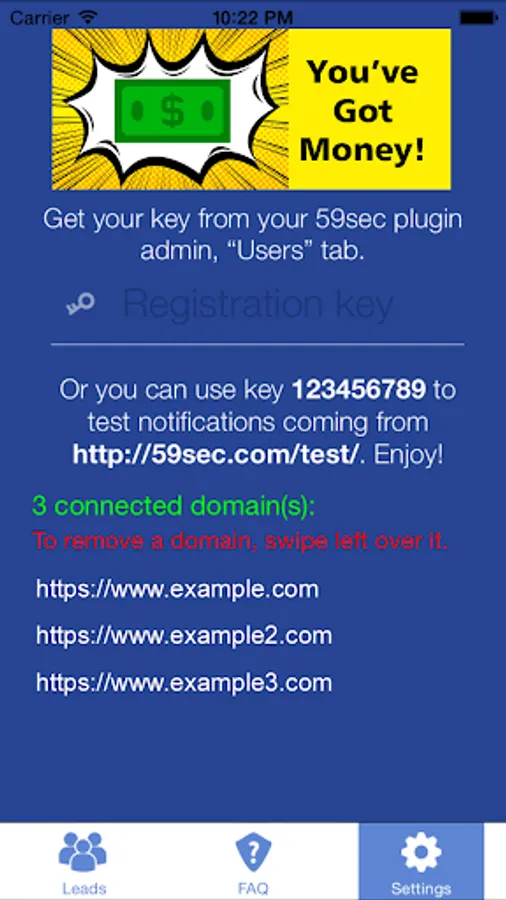- Connect your 59sec account to your mobile app (go to USERS tab, where you’ll find your key)