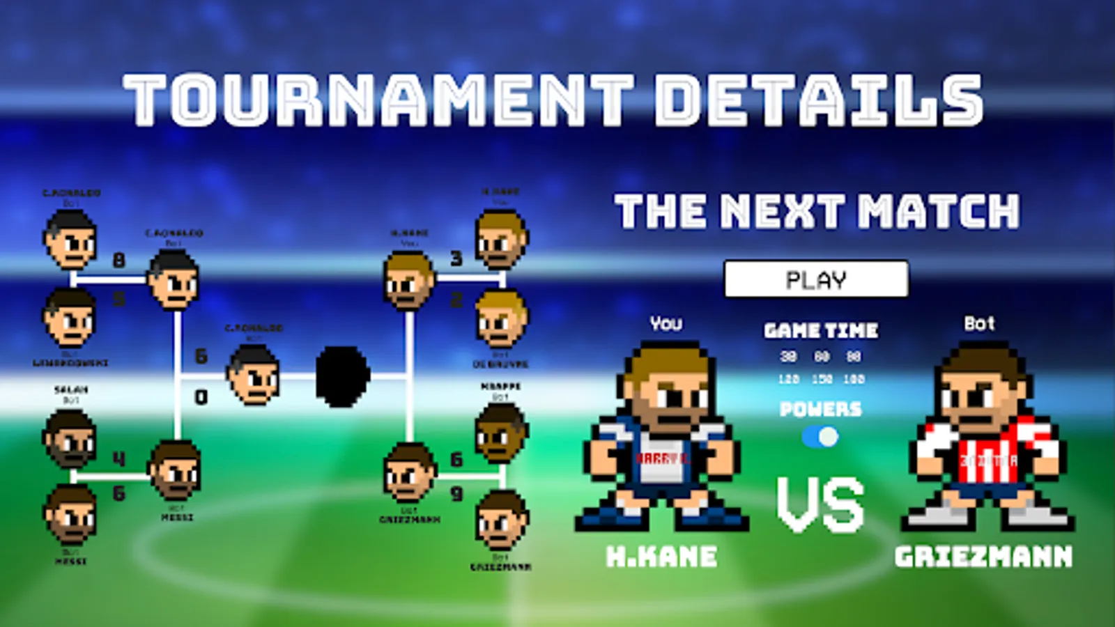 In 2 3 4 Soccer Games: Football you can play a tournament for 4 or 8 players and play 3 soccer matches if you pick 4 footballers or 7 football matches if you pick 8 footballers.