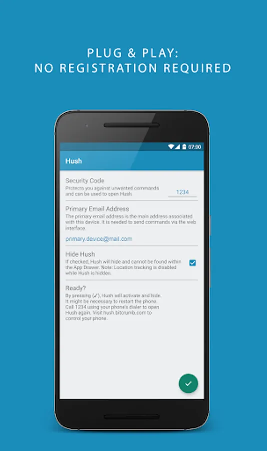 No need to register. Hush uses your device’s primary account email address to register itself. Just change your default password and you are ready to go.