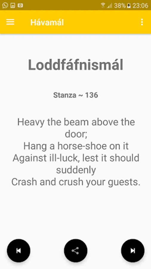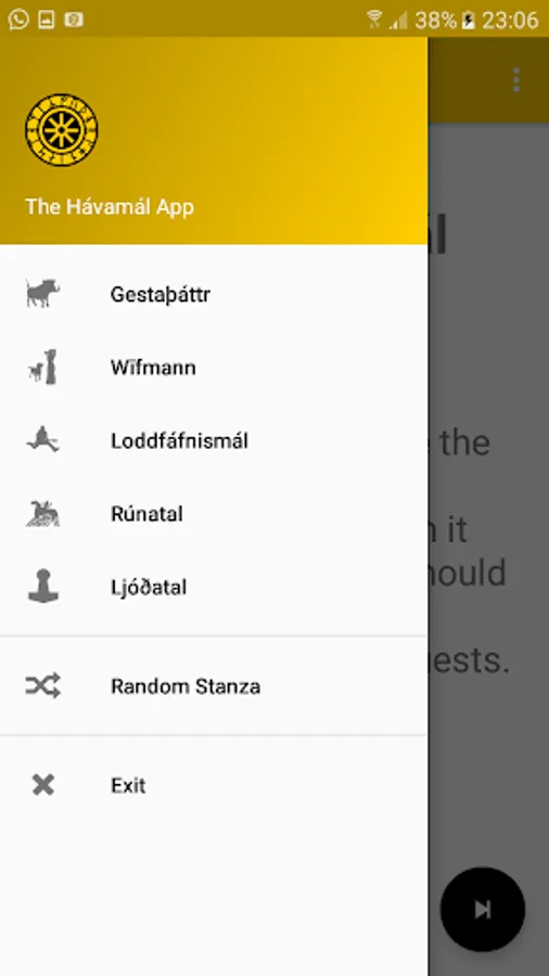 From the main menu you will be able to jump to any of the 5 different parts namely Gestaþáttr, Wīfmann, Loddfáfnismál, Rúnatal and Ljóðatal. From the main menu you can also choose to see a random stanza or exit the app.