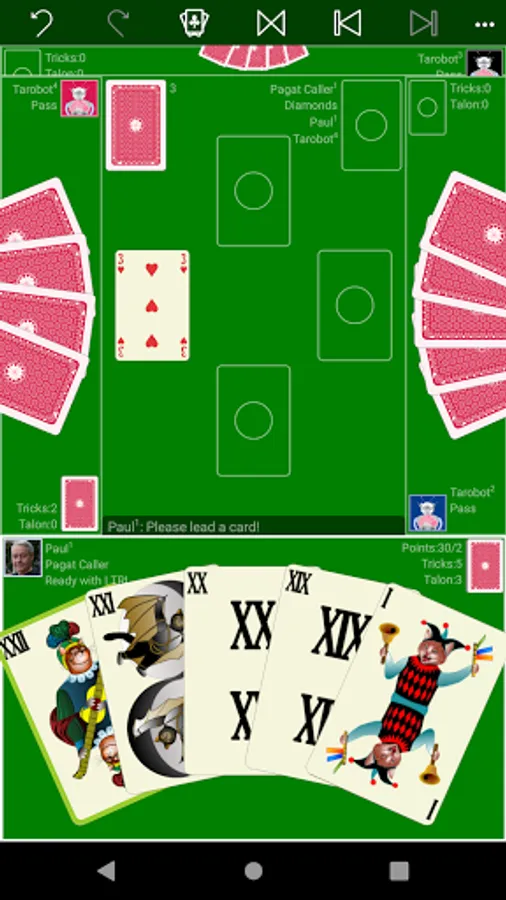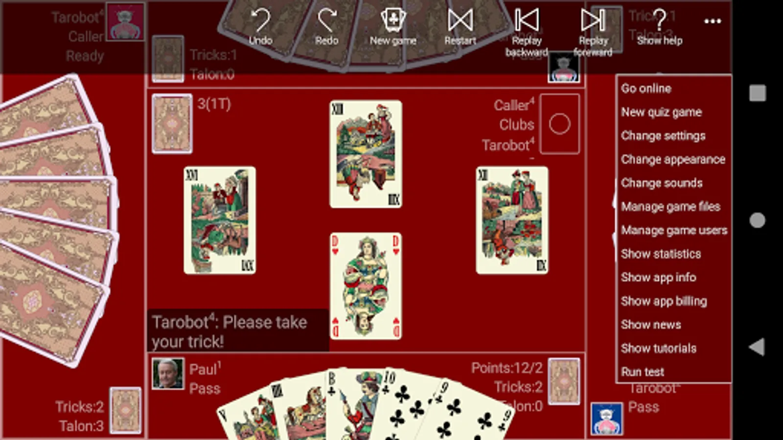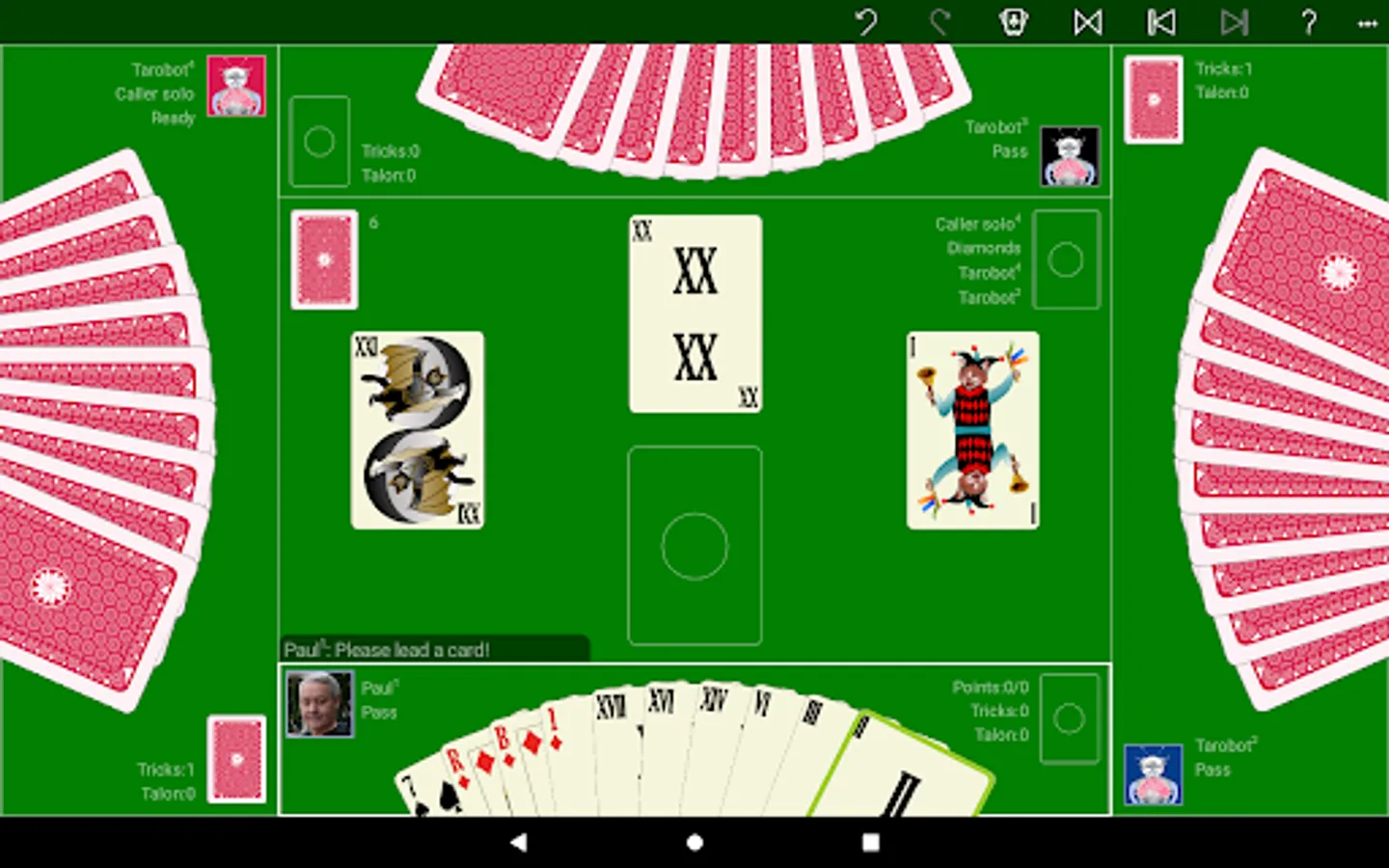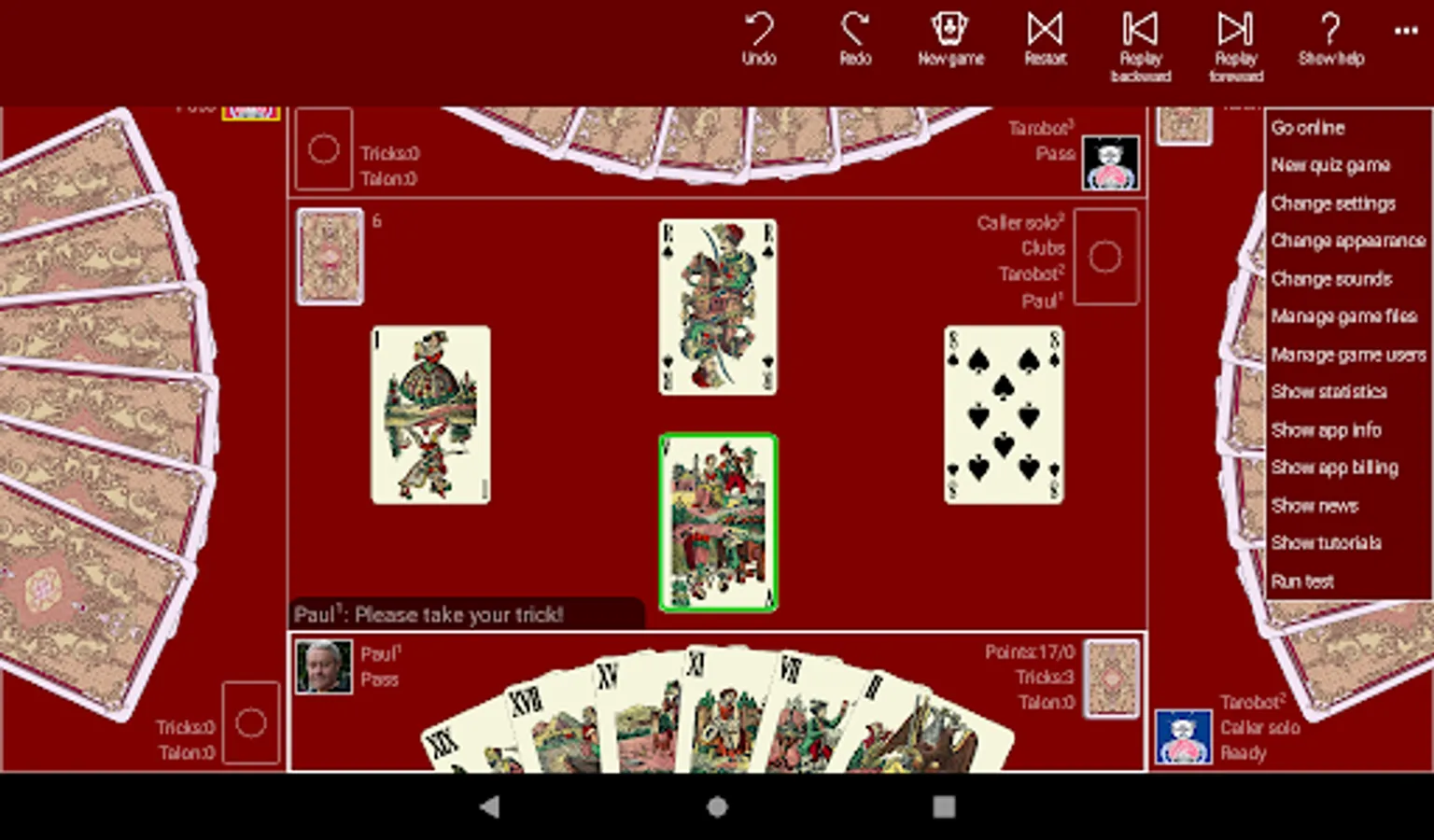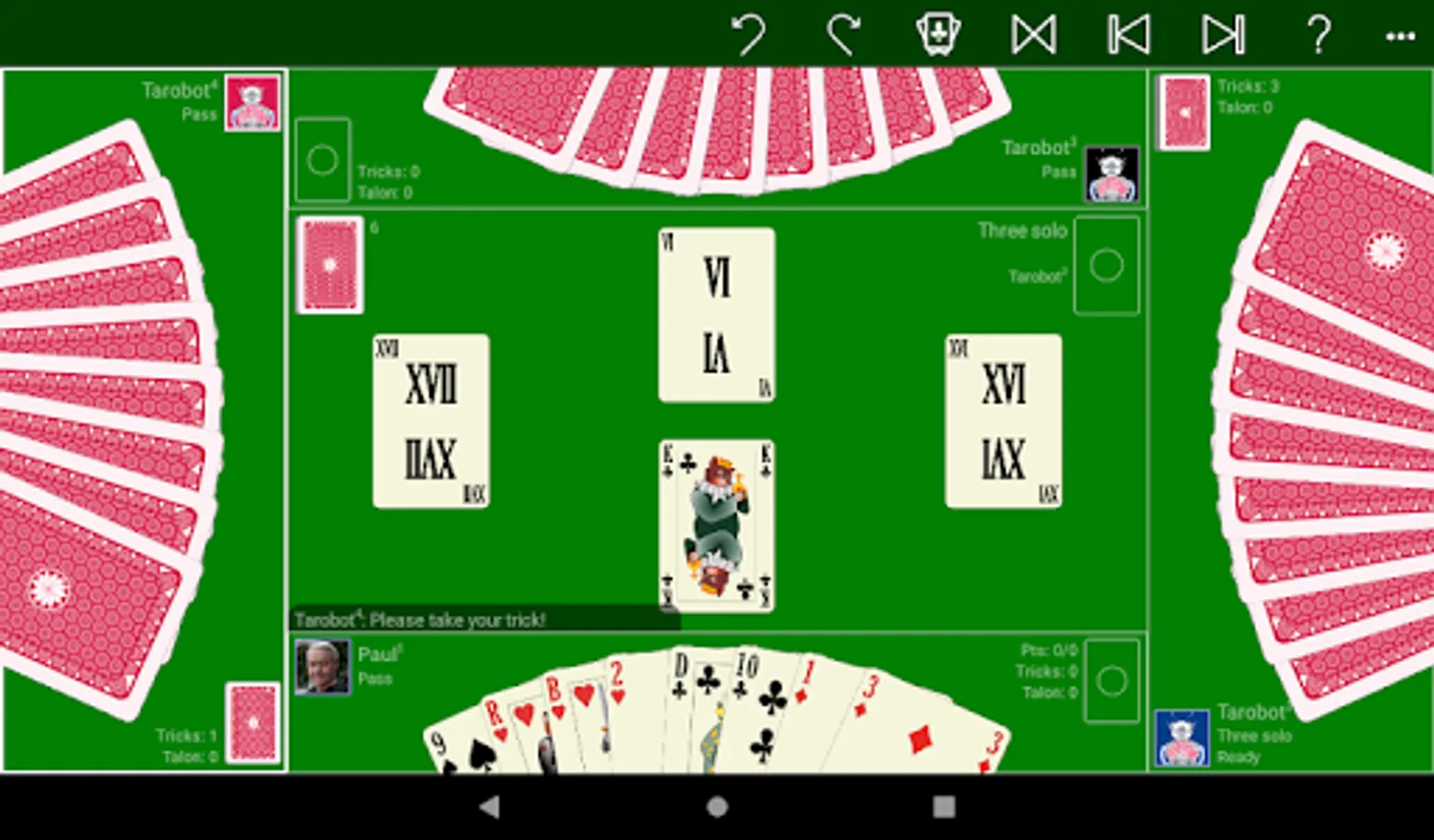 In this mode, the user controls at least one player. All other players will be controlled by the simulator "Tarobot". The simulator by the way sees only those cards the human player would also see. But you, too, can let the "Tarobot" assist you in playing. If you select the appropriate setting, it marks the action (playing card) on the user interface that it would perform in your place. You can also undo and redo all actions of the game.