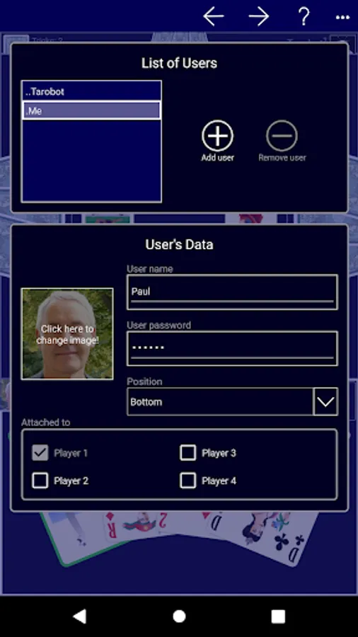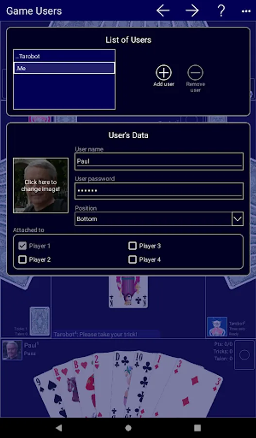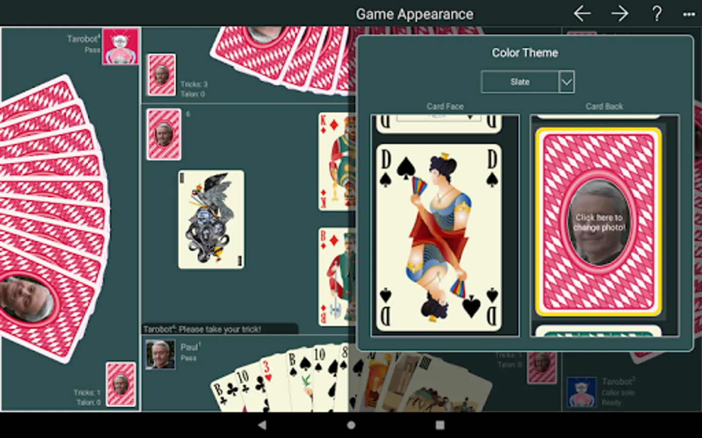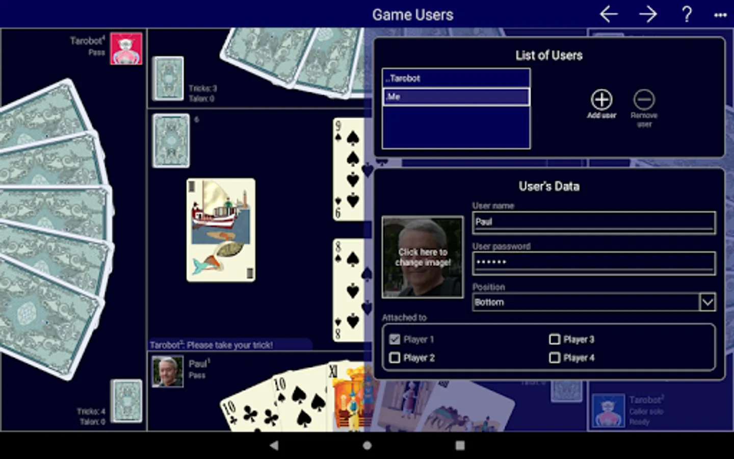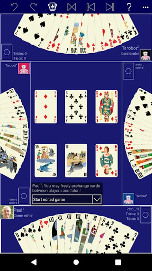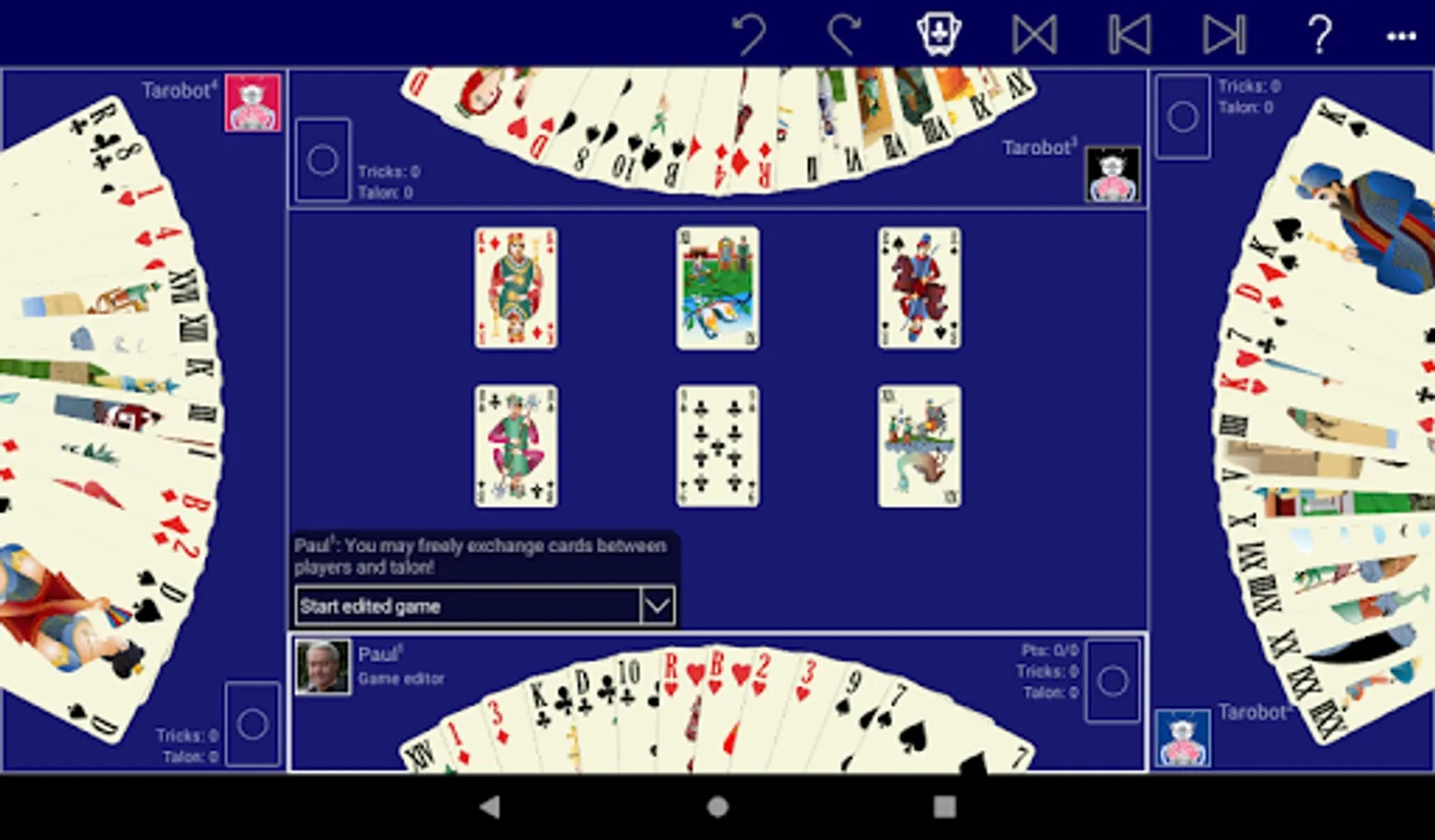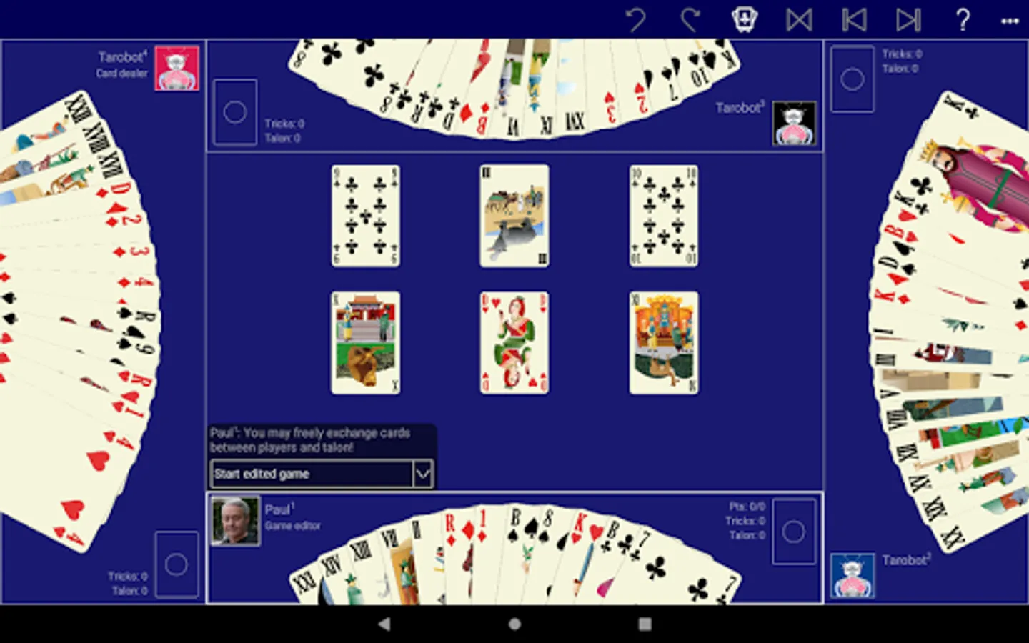 In this mode, the user controls at least one player. All other players will be controlled by the simulator "Tarobot". The simulator by the way sees only those cards the human player would also see. But you, too, can let the "Tarobot" assist you in playing. If you select the appropriate setting, it marks the action (playing card) on the user interface that it would perform in your place. You can also undo and redo all actions of the game.