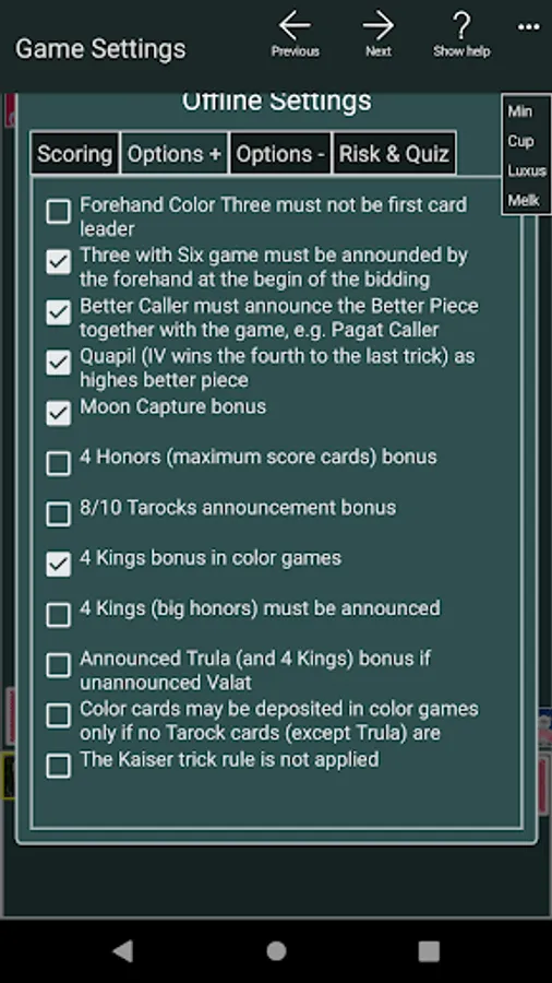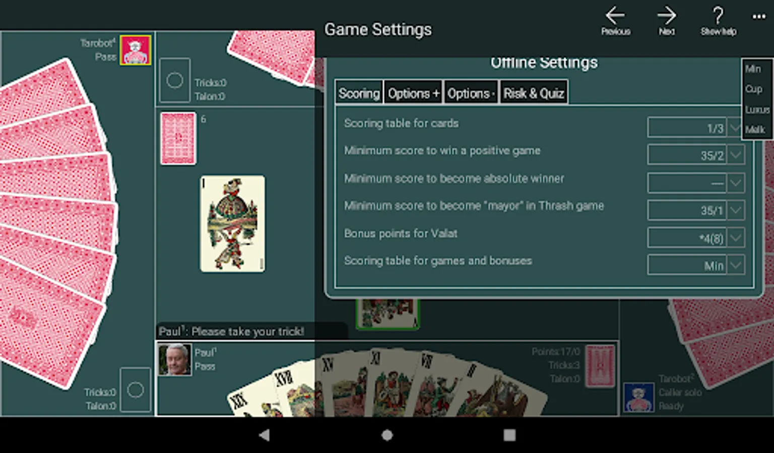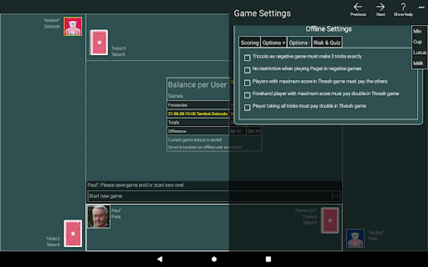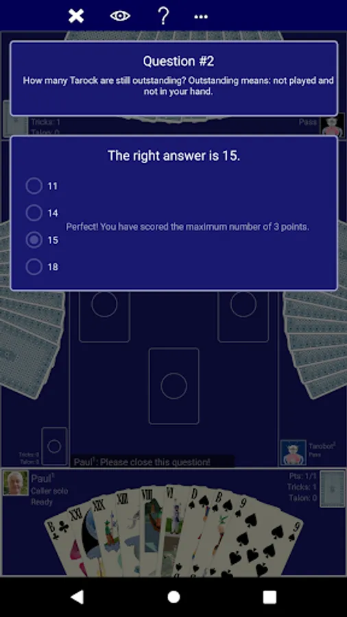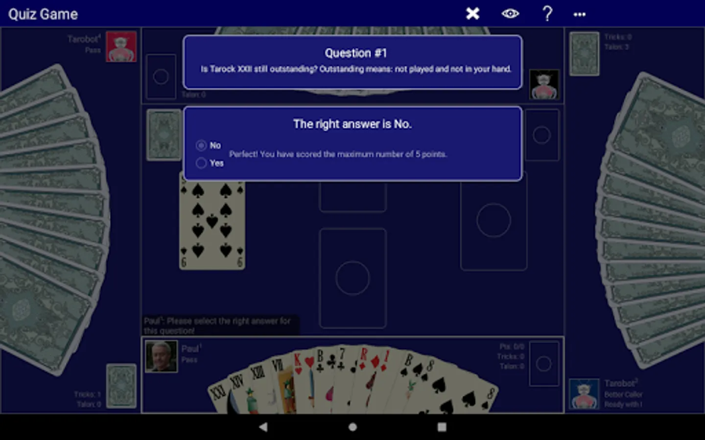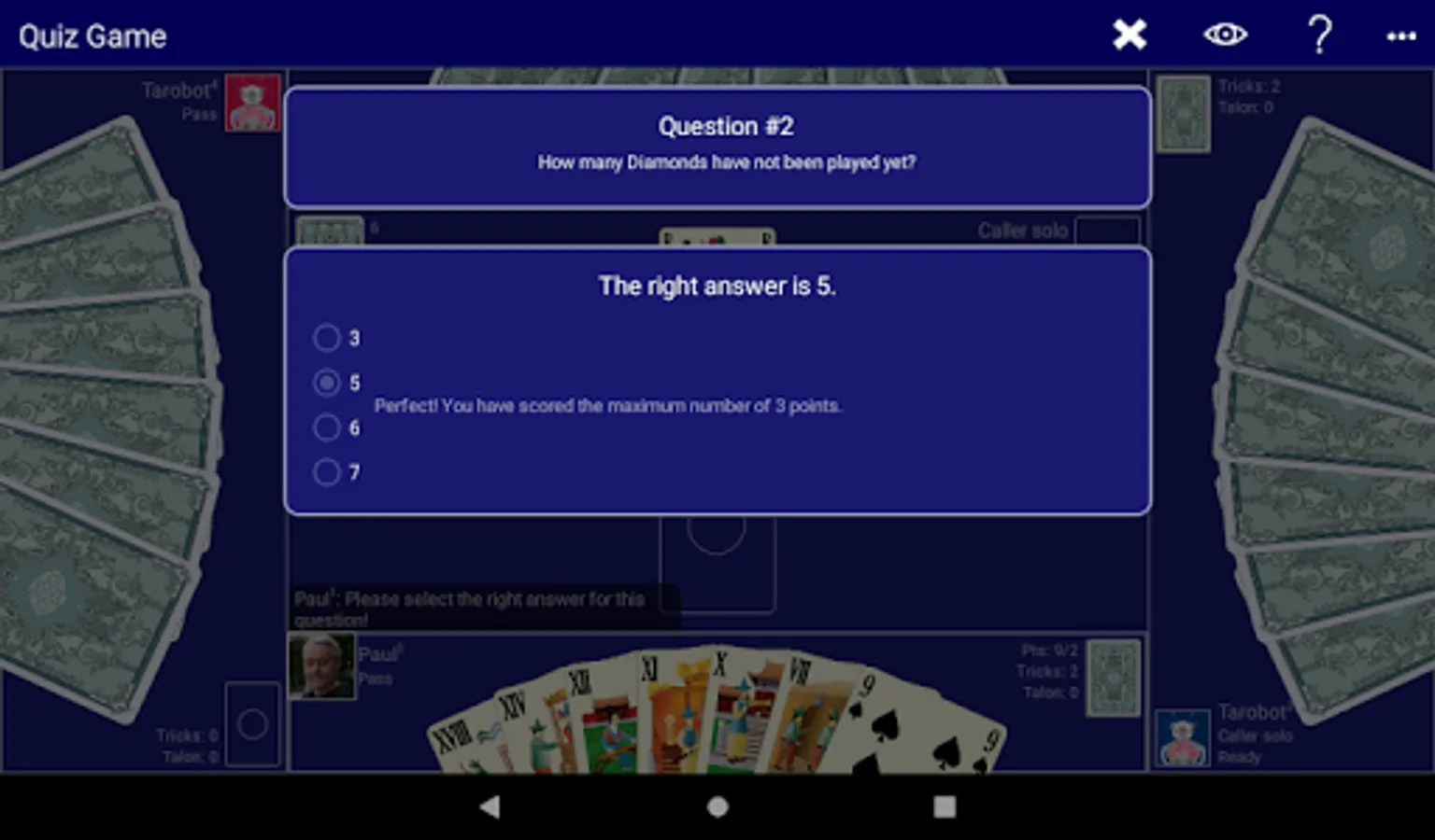 In the learning mode you can question any action that the "Tarobot" simulator proposes for you. He will then tell you the reasons why he thinks the action makes sense. Of course, the Tarobot is not a person who takes into account the psychology of other players. He is a pure numeric, who expresses everything in numbers to evaluate them with his algorithms. But he knows all the rules and can give the beginner important hints when practicing the game.