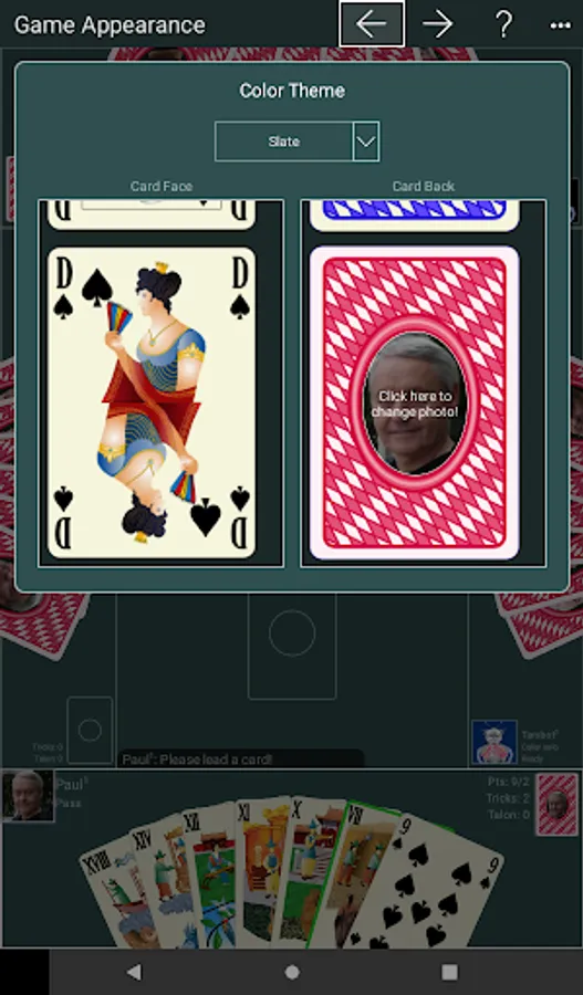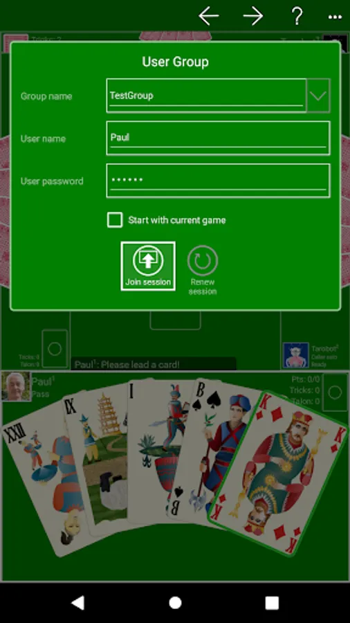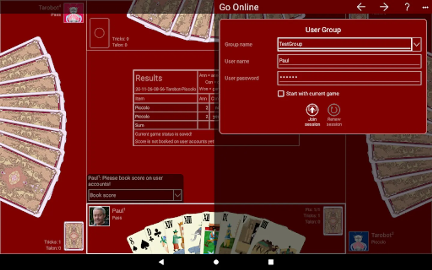 In this mode, a maximum of 4 members of an online group can play against each other online. In addition, up to 3 members can participate as bystanders in a session. If less than 4 online players join a session, the remaining players are simulated. A Skype audio conference should be held in parallel with the online session so that participants can talk just as they would in a real card round.