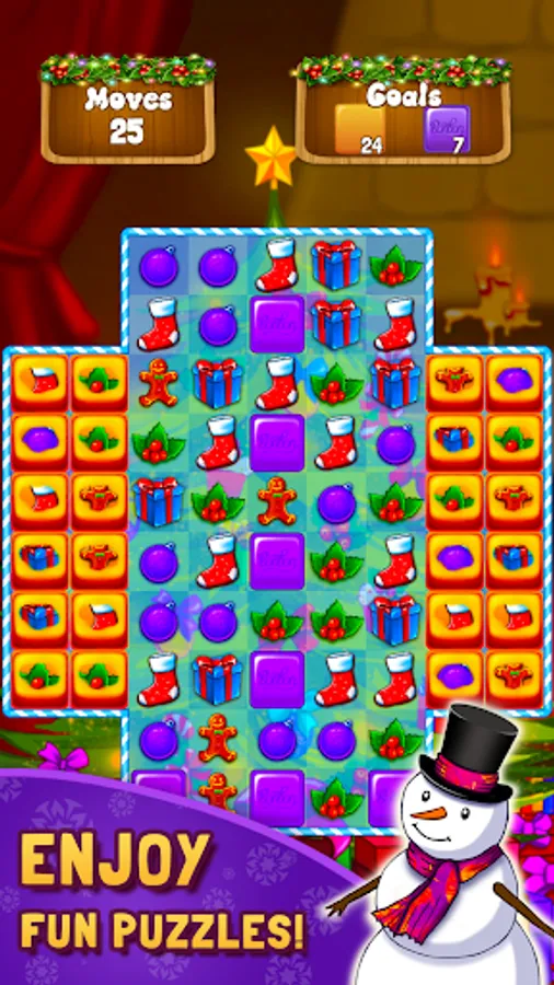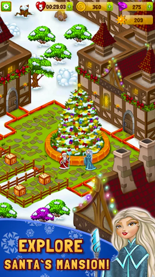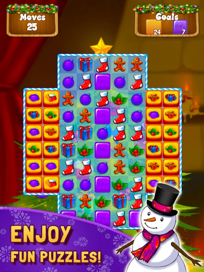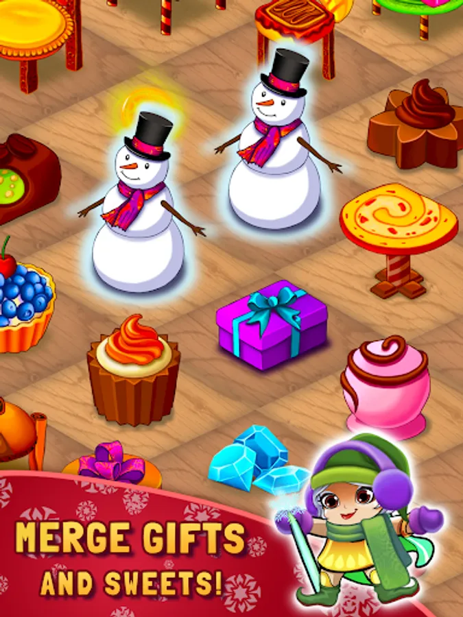 Merge magic items to create toys, gifts, candies, snowmen, and many more. Match-3 gifts and toys to unlock new rooms in the workshop.