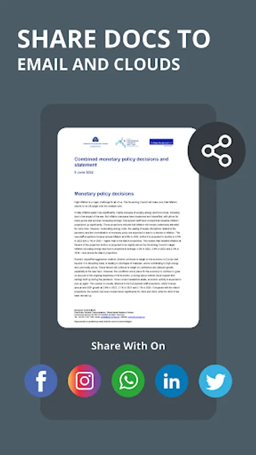 Seamlessly share documents over email, whatsapp, telegram or any other communication app.