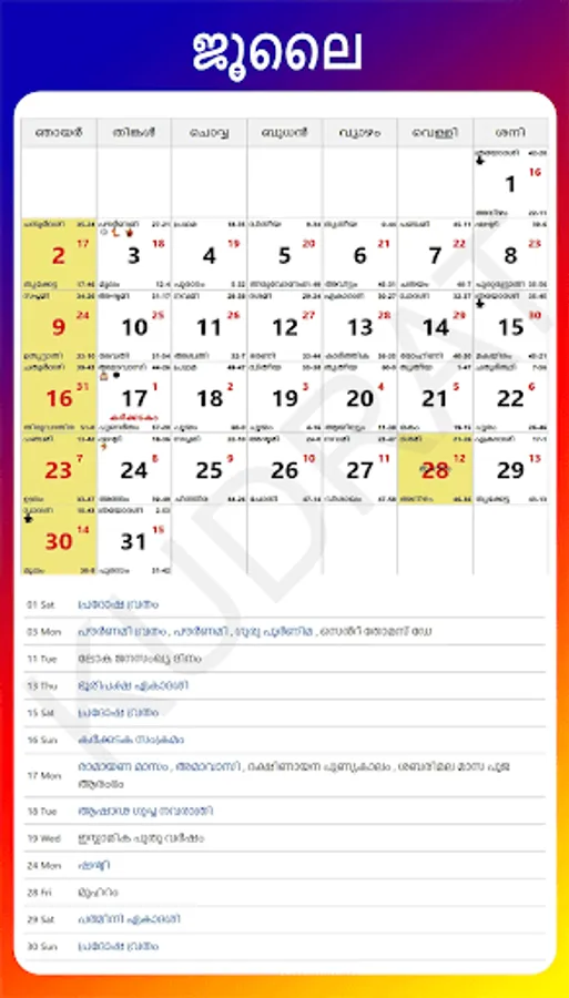 Malayalam Calendar also have details of information like auspicious days, Kollam Era (Kolla Varsham), Hijri Era (Hijara Varsham) , Saka Era (Shaka Varsham), Nakshatra, Thithi, Muhurtham, Rahu Kalam, Gulika Kalam, Udayam, Asthamayam and Niskara samayam, Yogam, Natchathiram, Chandrashtamam, Special Events, Quotes and Birthdays for the day. Further you can view Mel Nokku Naal, Keel Nokku Naal, Sama Nokku Naal in the offline day view