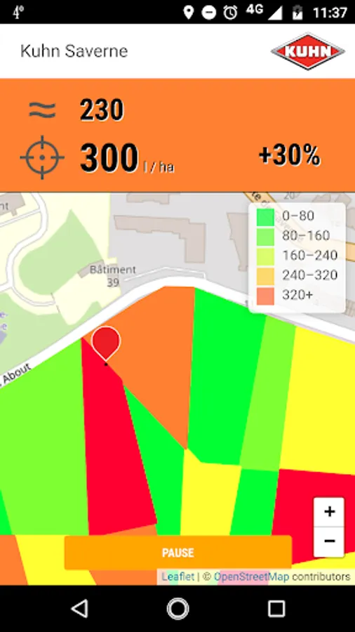 With KUHN EasyMaps, you can view your dose modulation map and your position on the plot directly on your smartphone or tablet. KUHN EasyMaps visually shows you the dose needed depending on your position on the plot, allowing you to manually adjust the settings on your machine.