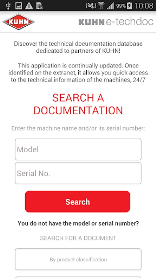 KUHN has developed a database for technical documentation dedicated to partners of KUHN, to help better respond to their needs. This tool, which is continually updated, provides quick access to technical information, 24/7. It is possible to quickly search all technical documents related to a specific product by searching by machine and/or serial number.