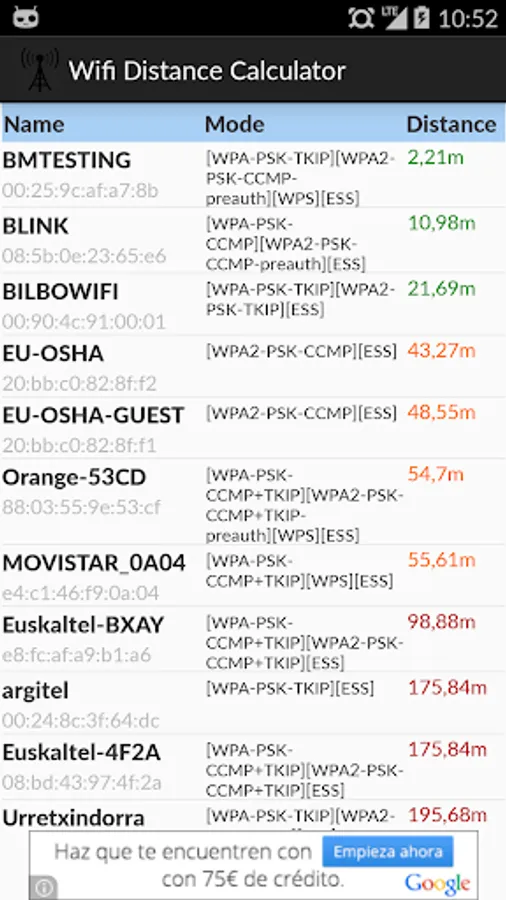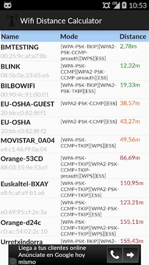 This app shows an estimated distance (meters) to your phone of nearby wifi networks.