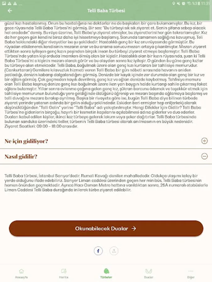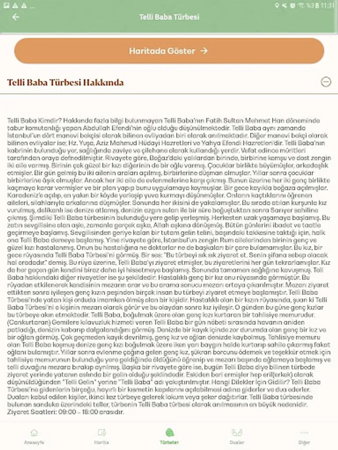 Saints; He is a friend of God who understood the truth and truth of the Holy Quran, acted in accordance with the guidance of the Prophet and thus rose to lofty degrees. You can get detailed information about nearly 1000 Muhammedi saints (friends of Allah) who lived in our ancient geography through our application. You can also access information such as the life story and legends of each saint, where his grave / tomb is, which shrine is visited for what purpose, and how to reach which shrine. By searching the mausoleums on the basis of provinces and districts, you can see the nearest and all other tombs on the map, access their details and directions, and mark the tombs you have visited. You can also access the prayers and suras suggested for your requests from Allah Almighty on the application.