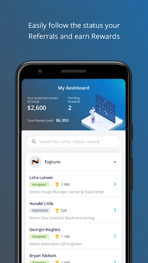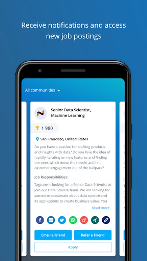 This app allows you to receive all job offers from your communities, easily share them on your social networks, Refer your friends and follow their progress on your personal Dashboard through the entire process! Receive notifications for new job postings, live status updates of your Refferals and Rewards!
