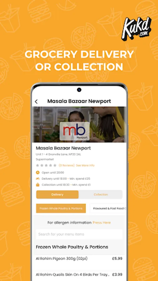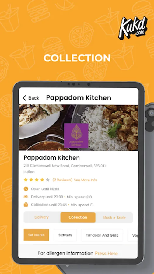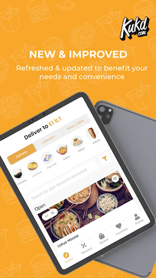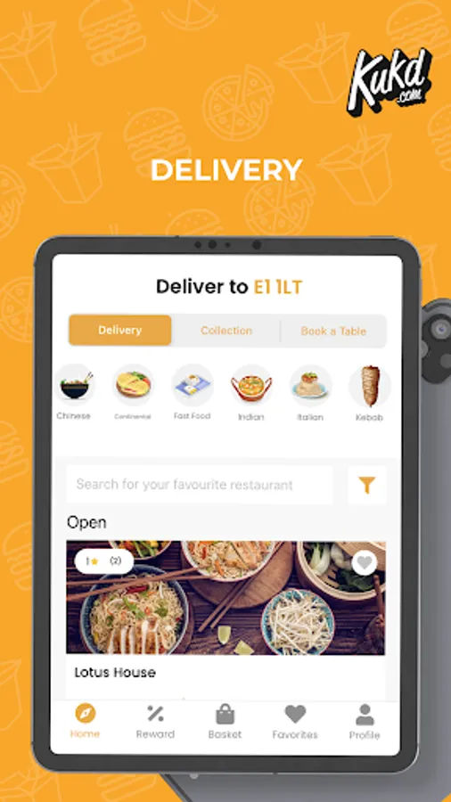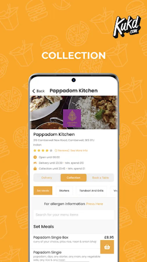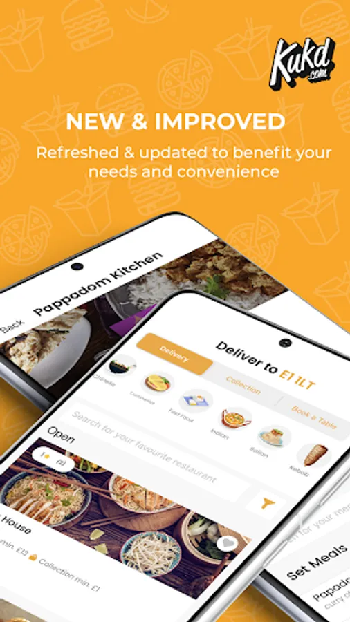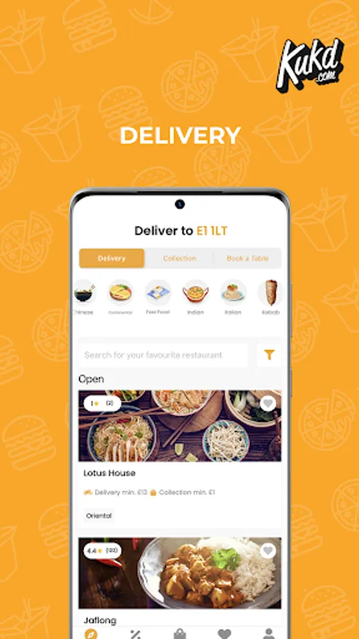 Need a takeaway? Order food online now with the free KUKD app! Find and order takeaway from restaurants across the UK and choose from more than 15 cuisine types including Indian, Chinese and Pizza takeaway. With the KUKD app you can browse takeaway menu’s, read and create reviews, make your order for collection or delivery and pay via card, cash or PayPal. Ordering takeaway has never been so easy!