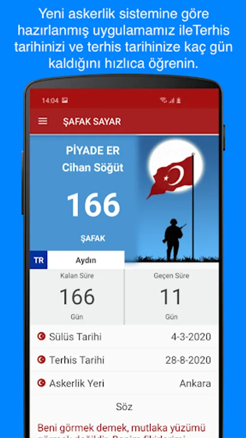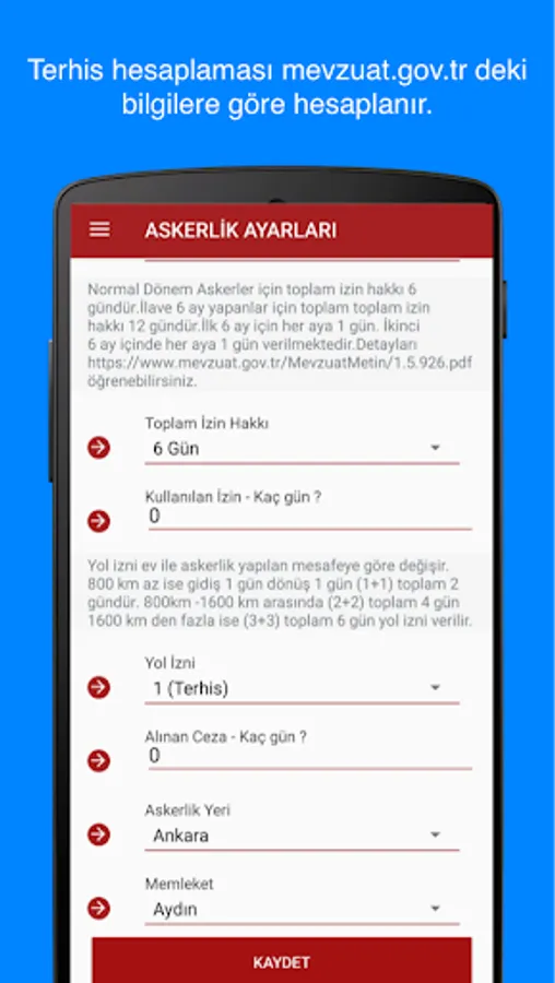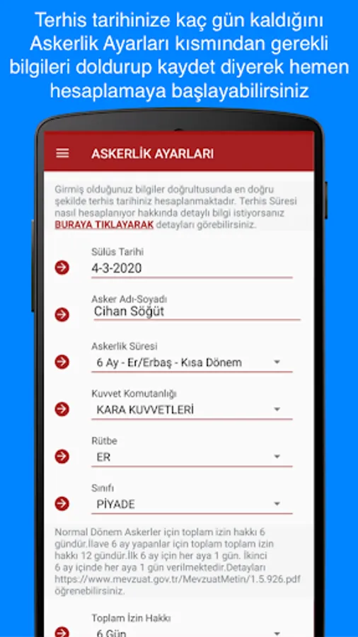 You must enter the military information correctly in the settings section of the application. If used permit road permit etc. If you don't write, the number of days remaining will appear less in your dawn calculation. Example is 340, not 365. The reason for this is explained in detail in the sample calculation given below.