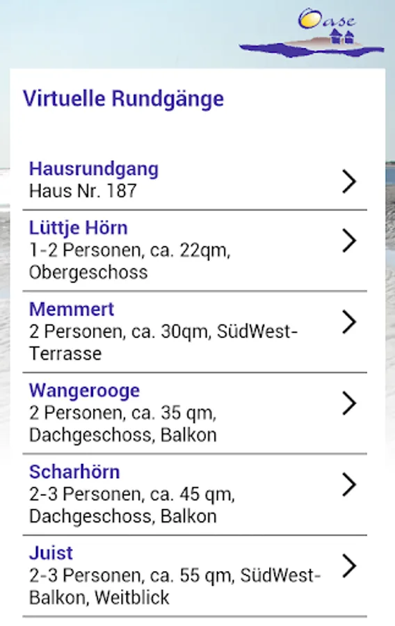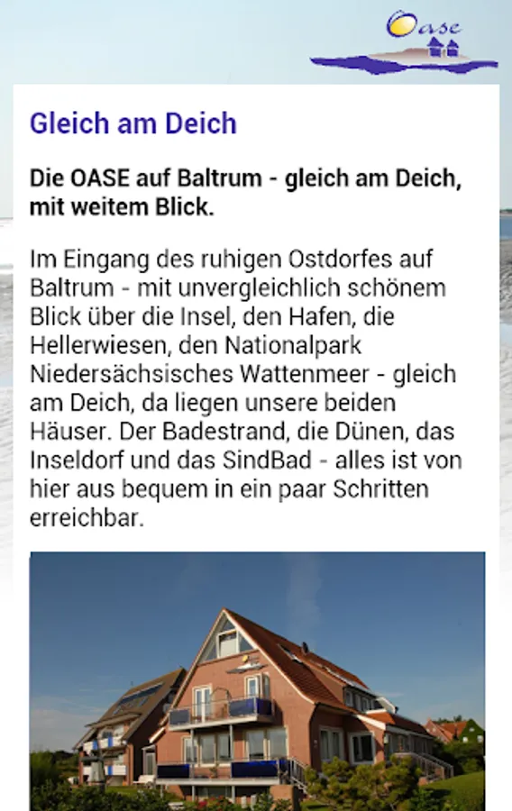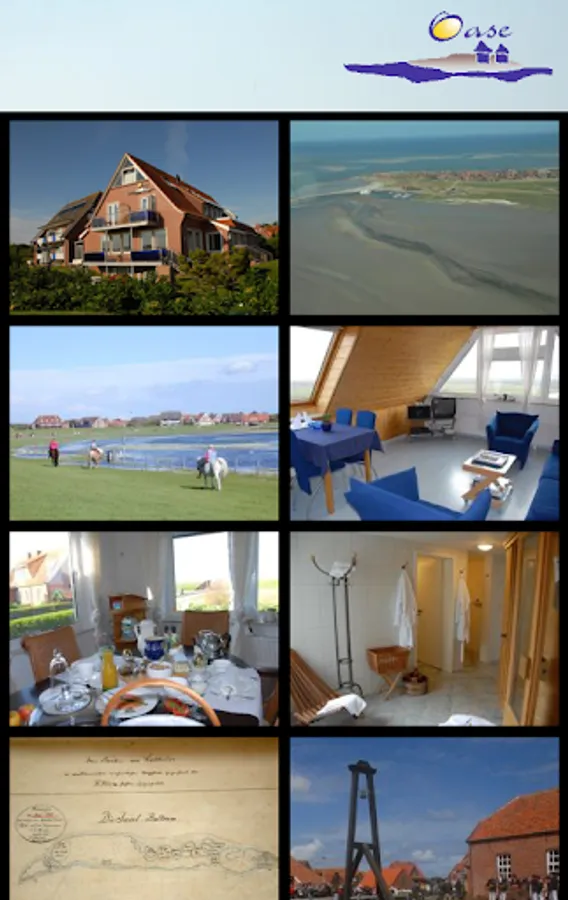 The content of this app have been specially prepared for mobile use on the go. The OASIS app offers the latest news, offers attractive and comprehensive info & photos to Vacation Rentals & Apartments also the possibility of direct contact. Particularly impressive are the virtual tour, with which one can commit almost all apartments in 360 °, as being there. A gallery of beautiful Baltrumfotos and the actual view through the OASIS webcam complete the offer. One has the Baltrumurlaub always in your pocket and can check at any time whether the desired date an apartment in the OASIS is still available.