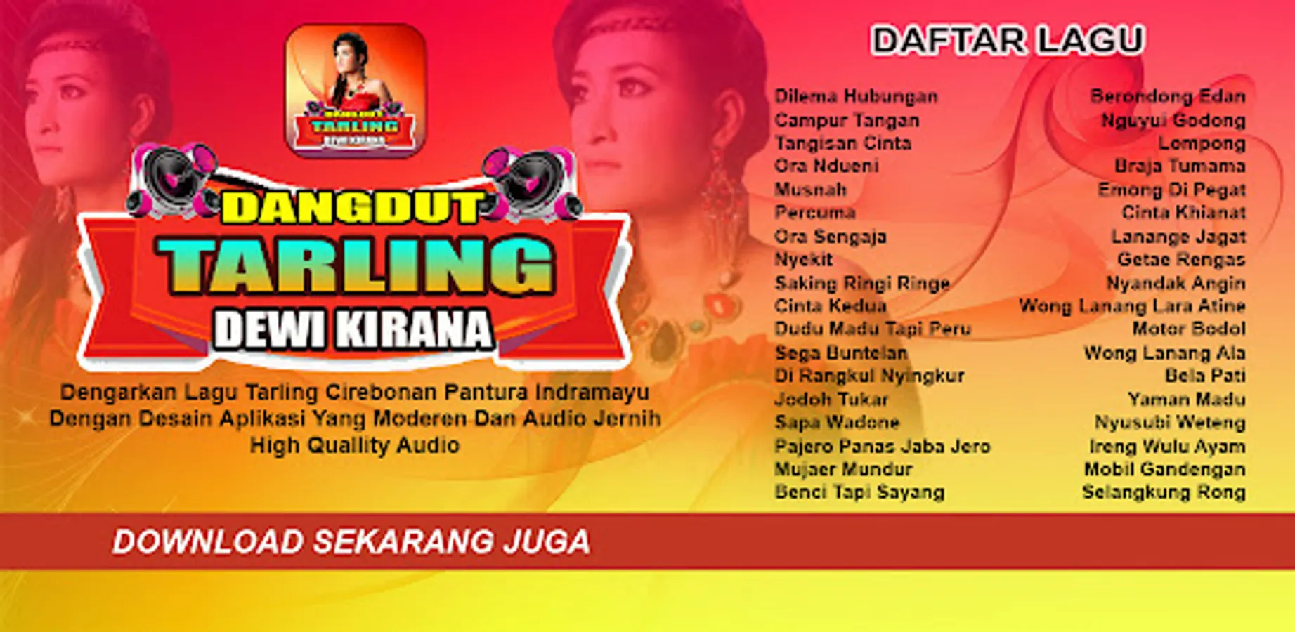 The Complete Tarling Song application is designed with an attractive appearance and the DANGDUT CIREBONAN SONG is always updated for all collections of Tarling Cirebon dangdut songs and collections of Tarling songs. if you are a fan of the MOST POPULAR TARLING SONG, then the most popular Tarling Cirebon dangdut collection application is recommended for you to download. Dewi Kirana has also collaborated with Wa Kantil, Anik Arnika, Indri Fahriza, Ayu Karlina, Cecep Tipung, Ella Nanorianto, Susy Arzety, Ity Ashela, Asep Kriwil and others.