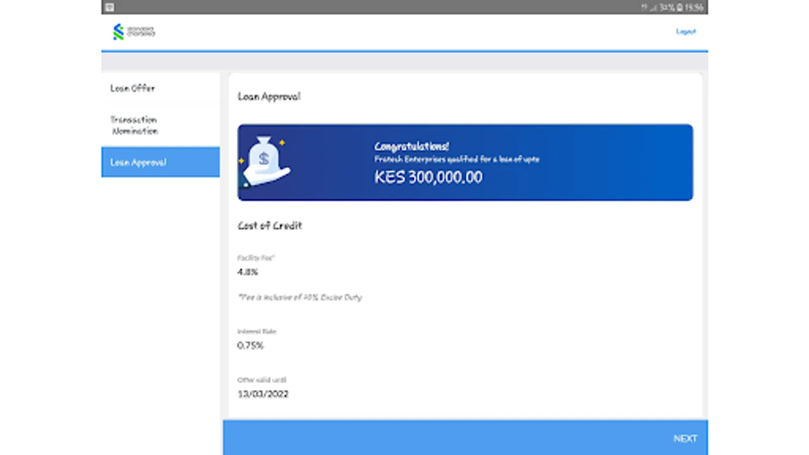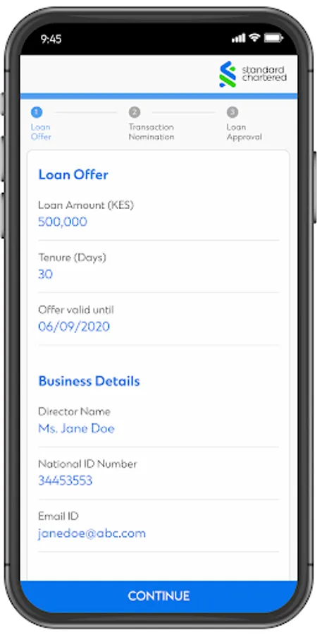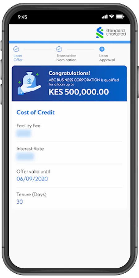SC Business was designed with two things in mind; the mobile and you. With SC Business, you can now get instant short term financing, from anywhere and conveniently. It combines an intuitive interface with flexibility to choose the loan amount, the interest applicable by choosing when to pay within your approved parameters. Simply put Power in your hands.