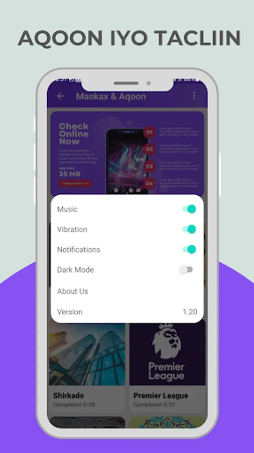 The app also includes a personalized learning feature, where it adapts quizzes based on the user's past performance. By analyzing the user's strengths and weaknesses, Maskax & Aqoon delivers tailored quizzes that optimize the learning process and encourage continuous growth.
